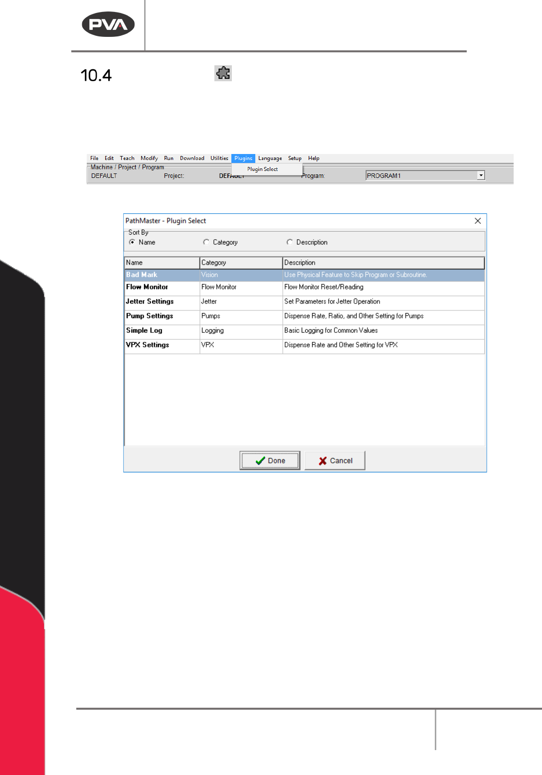 Machine Operati on Manual Revision L / February 2020 Page 78 of 200 Plugin Se lect Plugin Sele ct is where the user ca n selec t which pl ugins are u sed. 1. Select the Pl ugin Selec t i con or select Plugins - >Plugi…