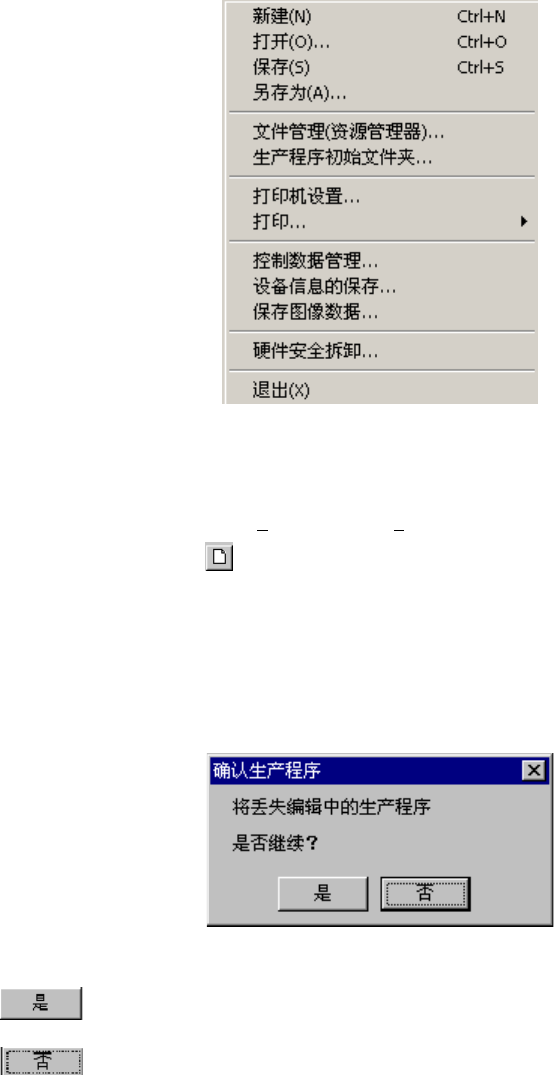 第 4 章 桌面 4-2-1 文件菜单 本节介绍文件菜单的操作方法。 图 4-2-3 文件菜单的下拉菜单 4-2-1-1 新建 操作方法 1 :选择菜单的[文件 (F) ]→[新建 (N) ] 操作方法 2 :选择工具栏的 操作方法 3 :按下 Ctr l + N 首先,进行生产程序数据的初始化。 如有未保存的生产程序时,会显示如下询问框。 图 4-2-4 生产程序确认信息 按下 :不保存文件,进行初始化。 按下 :中断处理,返回桌面。…