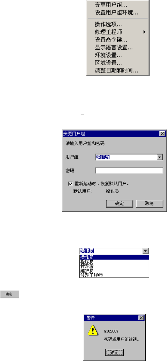 第 4 章 桌面 4-2-6 选项菜单 下面,对选项菜单进行说明。 图 4-2- 46 选项 4-2-6-1 变更用户组 操作方法 1 :选择菜单的[选项 (O) ]→[变更用户组 ... ]。 变更用户组画面。 图 4-2- 47 变更用户组 选择用户组,输入密码。 可选择的用户组级别如下: 图 4-2- 48 用户组的选择 单击 按钮:更改用户组级别。 当用户组和密码不一致时,显示如下对话框。 当选中[重新启动时,恢复默认用户]时,…