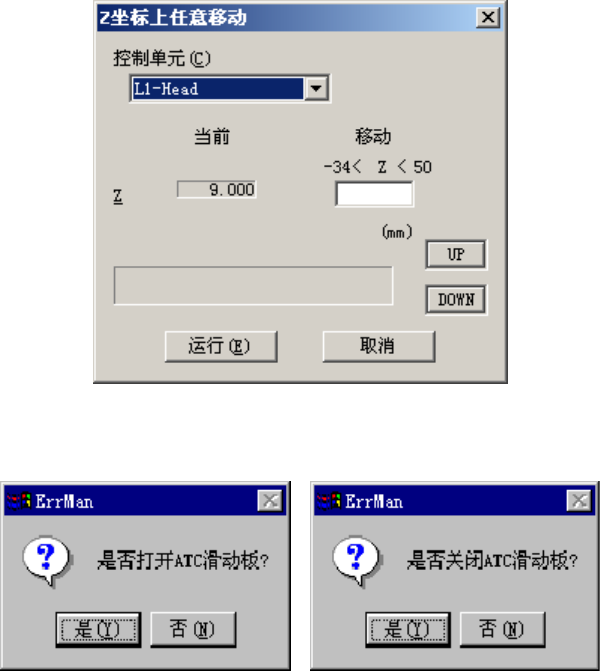 第 4 章 桌面 在 [Head 上的吸嘴状况 ] 画面上,按下[ Z 移动]按钮,会显示如下画面。 Z 轴的坐标原点为基板高度坐标原点( 0 ) ,之上为“+ ” ,之下为“- ” 。 图 4-4-6 Z 任意坐标移动画面 步骤 2 : 在 [Head 上的吸嘴状况 ] 画面上, 按下 [打开 ATC ] 、[ 关 闭 ATC ] 按钮, 会显示如下确认对 话框画面。 图 4-4-7 ATC 滑动板开关确认对话框 4- 49
