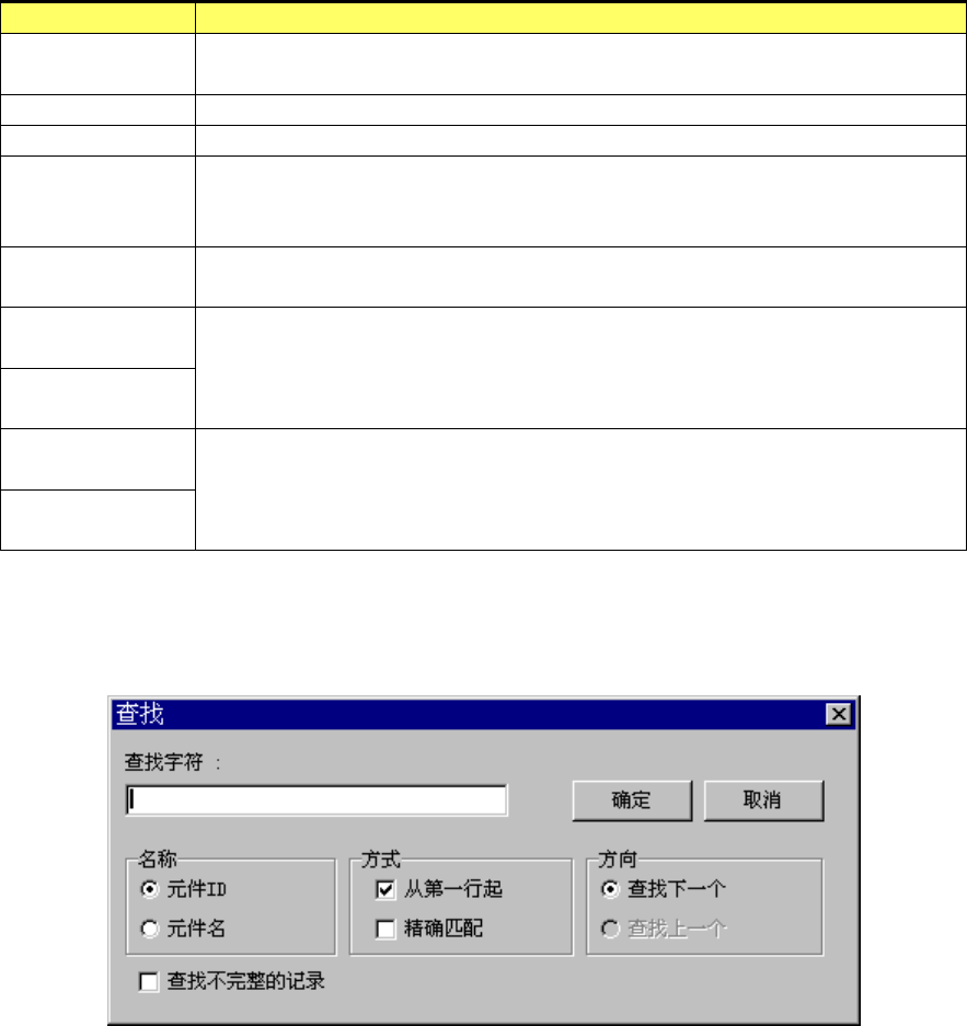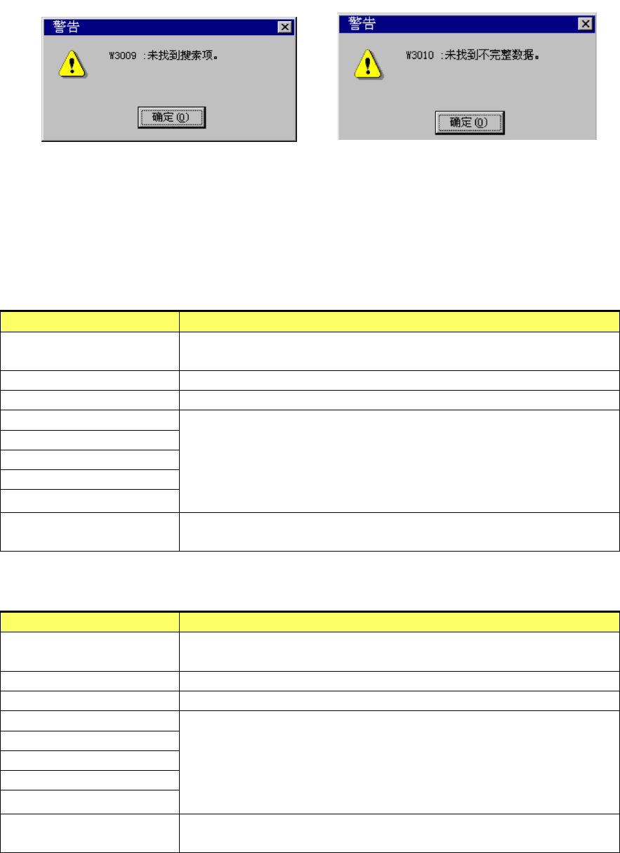 第 5 章 编辑程序 指定[不完整的记录]为查找条件时,不能选择[元件 ID ]、[元件名]、[精确匹配] 。 查找结果没有发现一致数据时,出现下列的信息。 图 5-7- 19 未 找到搜索项时 图 5-7- 20 未找到不完整数据时 输入的查找文字和查找条件,保存到下一个查找对话框出现为止。 5-7-4-9 向前查找、向后查找 [ 向前查找 ] 、 [ 向后查找 ] 命令在各画面中的操作方法如下。 表 5-7- 12 向前查找命令 各…