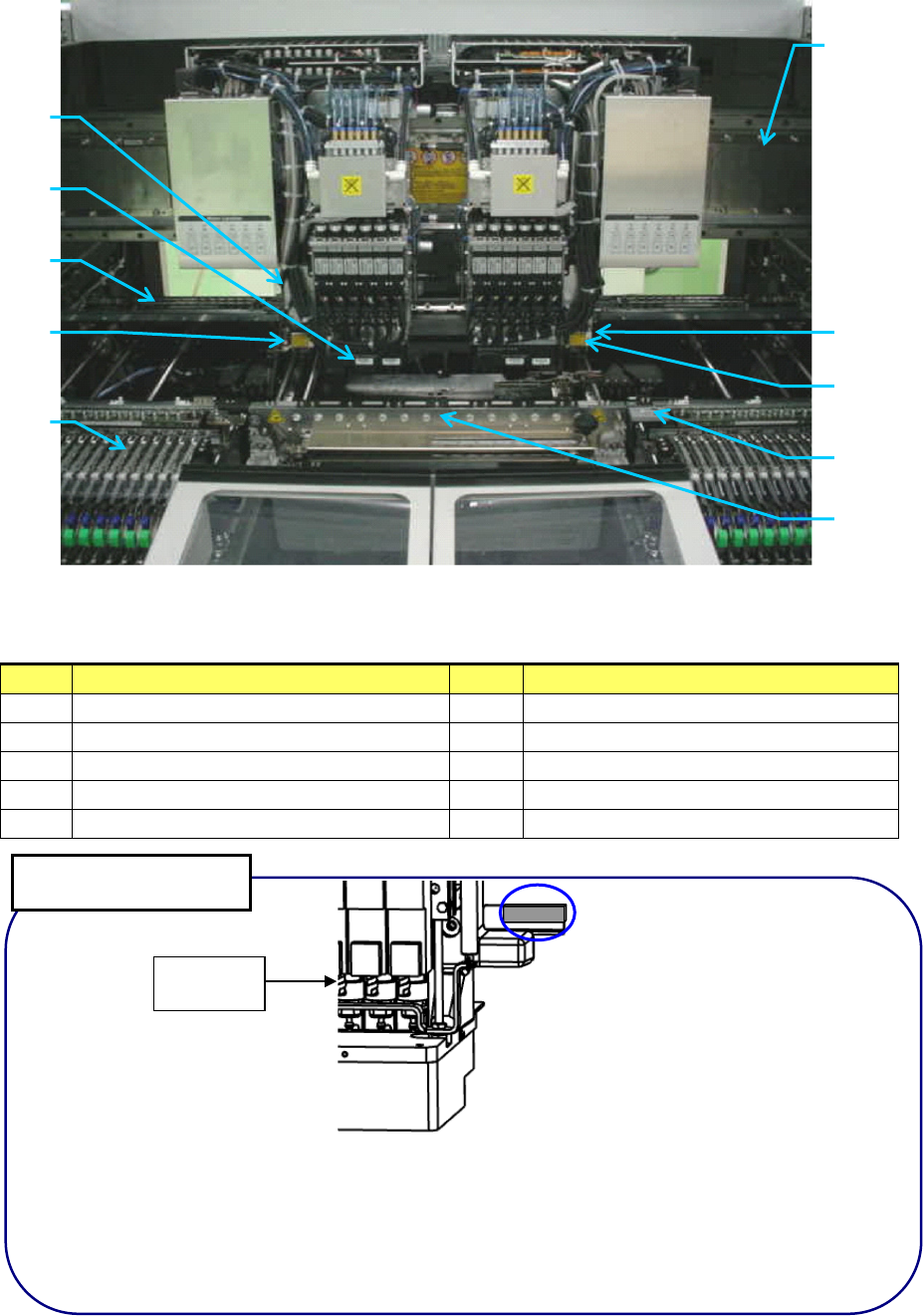 第 1 章 设备概要 设备内部的主要构成如下图所示。 图 1-4-3 设备内部构成 No 名称 No 名称 ① Y 台轴 ⑥ OCC ( 位置校正摄像机 ) ② X 梁架 ⑦ CAL 校准台 ③ LNC 贴片头 ⑧ 自动工具交换装置 (ATC) ④ HMS ( 高度测量装置、选购项 ) ⑨ (LF 左前 ) 送料器台架 ⑤ BMR ( 坏板标记识别器、选购项 ) 如上图所示,左 Head 上安装有接近传感器。请注意,勿使工具或手表等金属…