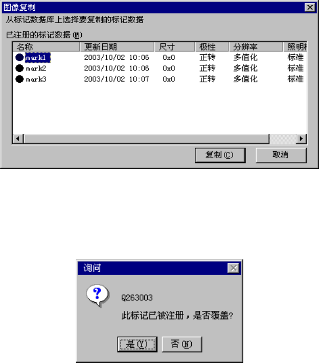 第 5 章 编辑程序 选择 [ 图像复制 ] 命令后,显示下列对话框。 从已注册的标记数据列表中,选择需要复制的标记数据,按[复制]按钮。 图 5-7- 35 图像 复制对话框 按 [ 复制 ] 后,是 BOC 标记时,标记示教显示 “ * ” 。 是基准领域标记时,标记 TI 的单元格显示[ OK ]。 标记数据已经注册完毕时,会出现下列覆盖确认提示。 图 5-7- 36 标记覆盖确认对话框 5- 110