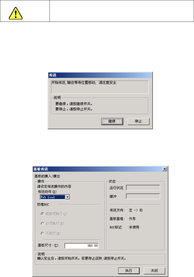 第 6 章 编辑辅助功能 (1 ) 操作框 图 6-5-4 基板传送对话框:操作框 ① 传送动作 从列表中选择 Pwb load( 搬入 )Pwb e ject( 搬出 ) 。 ② 校正 BOC 选择搬入基板后是否立即执行 BOC 校正。 选择了 [ 按选项执行 ] 时,适用操作选项设定的示教项目。 ③ 基板尺寸 Y 在生产程序中设定了基板外形尺寸时,则显示设定的默认值。 (2 ) 状态框 逐项显示目前基板的传送内容以及运行状况。 图 …