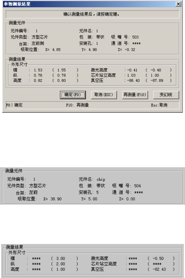 第 6 章 编辑辅助功能 6-5-3-4 单独测量结果 单独测量结束后,结果显示在以下对话框。 图 6-5- 18 单独测量结果对话框 测量元件 显示元件内容和吸取位置。 测量结果 显示测量结果的数值。()内表示元件数据的原数值。 未测量的项目,显示, “ **** ” 确定 ([F 8] 键 ) 将测量结果变为有效状态,覆盖到元件数据上。然后返回单独测量条件设定画面。 取消 ([ESC] 键 ) 测量结果为无效,然后返…
