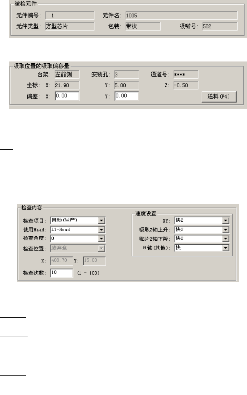 第 6 章 编辑辅助功能 ① 被检元件 显示被检查元件的内容。 ② 吸取位置的吸取偏移量 显示吸取元件的吸取位置的内容。可以向前代 替元件或后代替元件变更吸取位置。没有吸取数 据时,各项目不显示,不能进行吸取位置的变更、送料器顶推、示教。 送料 可以顶推一次送料器输送元件( 32 mm 纸粘接带除外) 。 偏差 移动吸取坐标时要设定偏差。可以使用 HOD 装置进行示教。不被反映到吸取数据。 ③ 检查内容 选择检查的内容。因检查项目不同,…