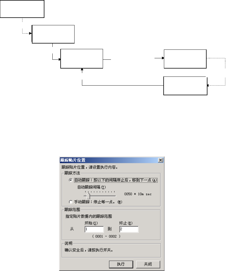第 6 章 编辑辅助功能 1) 跟踪方法 ① 自动跟踪 按照一定的间隔,用摄像机按顺序跟踪贴片位置。 设定 [ 自动跟踪间隔 ] 的时间,经过该时间后自动移至下一点。 ( 自动跟踪间隔 ) 使用上面的刻度条,调整停止跟踪间隔。以 10 msec 单位,最大可设定为 5 秒。 ② 手动跟踪 等待操作员操作,之前不向下一个点的移动。 2) 跟踪范围 指定贴片数据内的跟踪范围(从第几点到第几点) 。 默认值为跟踪全部贴片点。 设定实施所有跟踪…
