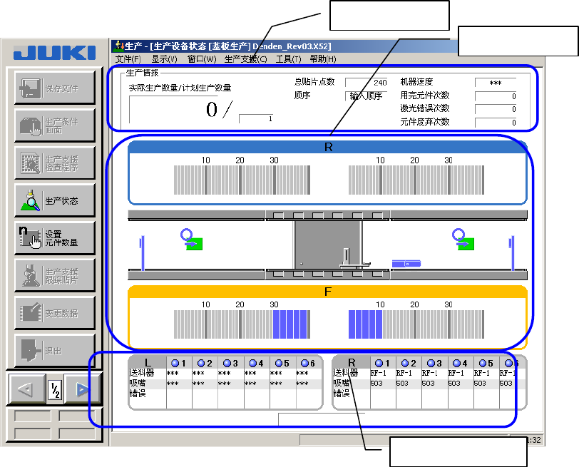 生产设备状态画面主要显示生产情报、设备状态、以及贴片头(HEAD)信息等。