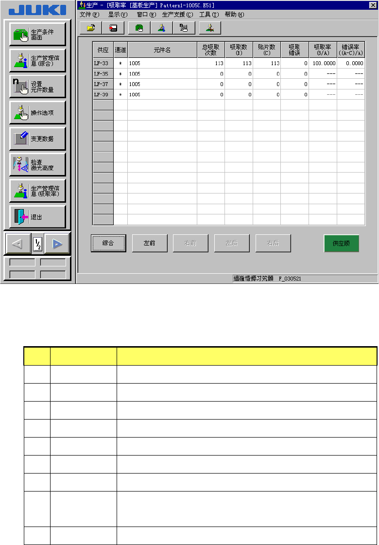 从生产管理信息菜单栏中选择[窗口]→[生产管理信息]→[吸取率]后,显示送料器的吸
