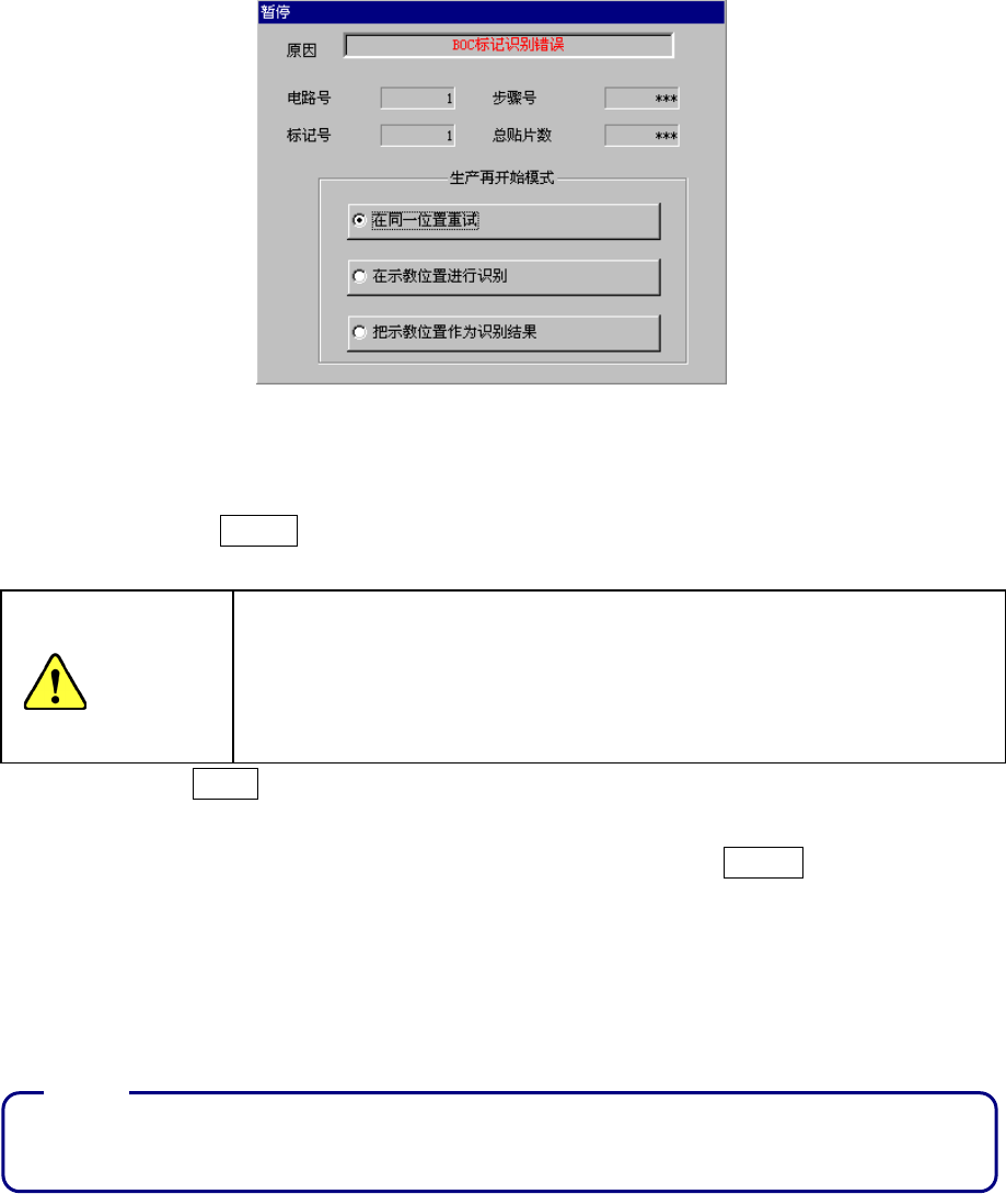 发生 BOC 标记、基准领域标记、送料器台架标记识别错误时,会显示如下暂停对话框,进入