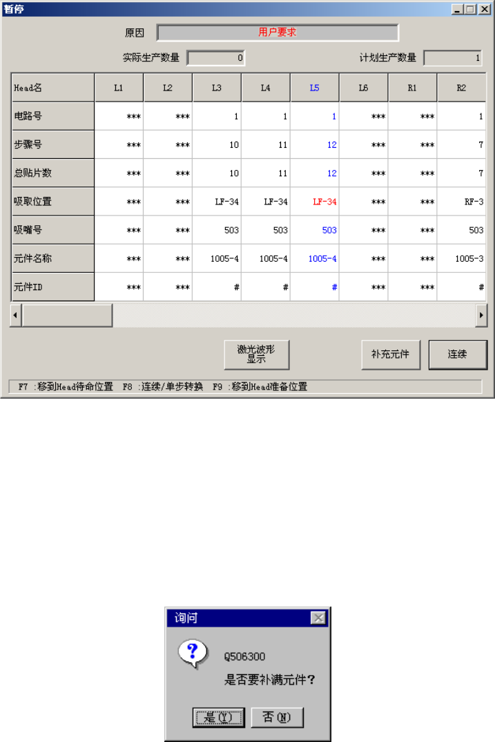 图所示,会在生产暂停时的暂停对话框中显示[补充元件]按钮。