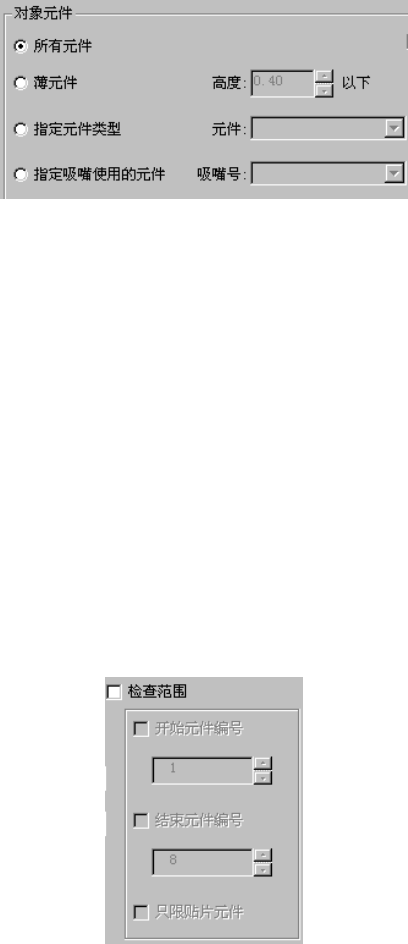 第 8 章 生产 1) 对象元件 在元件数据中,若只需检查符合一定条件的元件时,可以设置 [ 对象元件 ] 项目。 ① 所有元件 检查所有元件数据。 ② 薄元件 只检查元件高度小于编辑框中设置值的元件。 ③ 指定元件类型 只检查下拉菜单中选择的元件类型。 ④ 指定吸嘴使用的元件 只检查下拉菜单中选择的吸嘴使用的元件。 2) 检查范围 在对象元件的条件中,要缩小元件编号范围时,可选中 [ 检查范围 ] 。 选中后,可设置下图的内容。 ① …