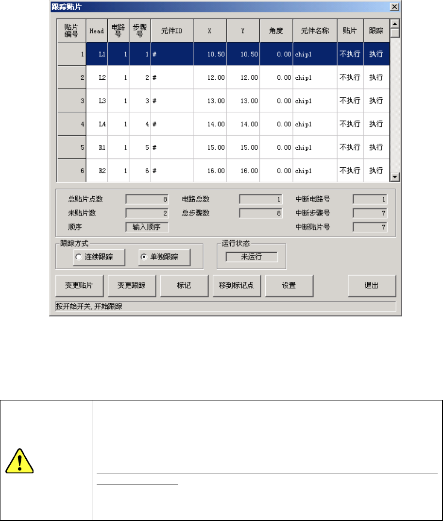 连续跟踪 按照下一项说明,从所设置的跟踪开始位置,对贴片点列表的跟