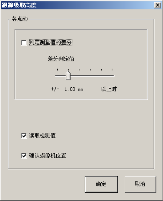 有关吸取位置自动示教、确认、示教中显示的吸取跟踪对话框,请参见「6-5-5-4 坐标系:吸取