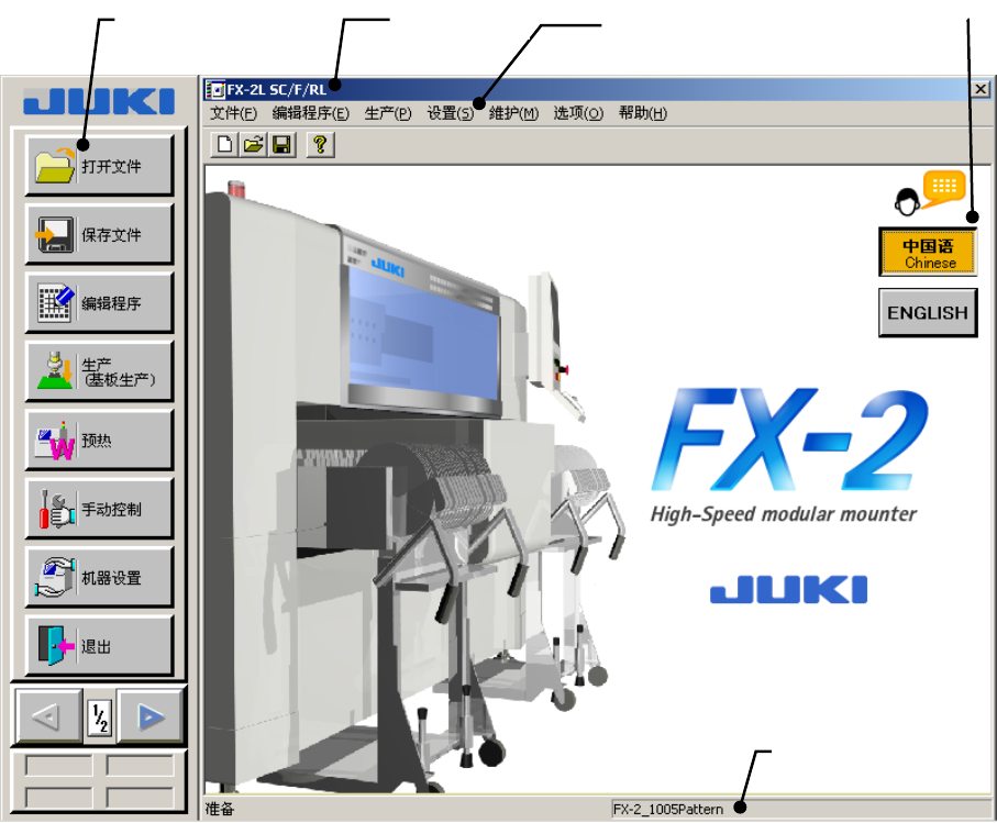 第 2 章 基本操作 2 基本操作 2-1 画面构成 下面,对画面的基本结构进行简要的介绍: 图 2-1-1 桌面画面的组成示例 ③命令按钮 ② 菜单栏 ①标题栏 ④语言切换按钮 ⑤状态栏 2-1