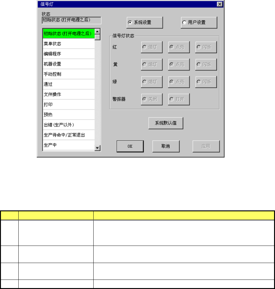 第 9 章 机器设置 (3) 初始值 表 9- 4- 24 初始值 No. 状 态 信号灯模式 备 注 亮灯状况 红 黄 绿 警报器 1 初始状态(打开电源之后) 三个颜色的灯全亮 ____ ____ ____ OFF 2 菜单状态 黄灯亮 ― ____ ― OFF 3 编辑程序 黄灯亮 ― ____ ― OFF 4 机器设置 黄灯亮 ― ____ ― OFF 5 手动控制 黄灯亮 ― ____ ― OFF 6 空运行模式 黄灯亮 ― …