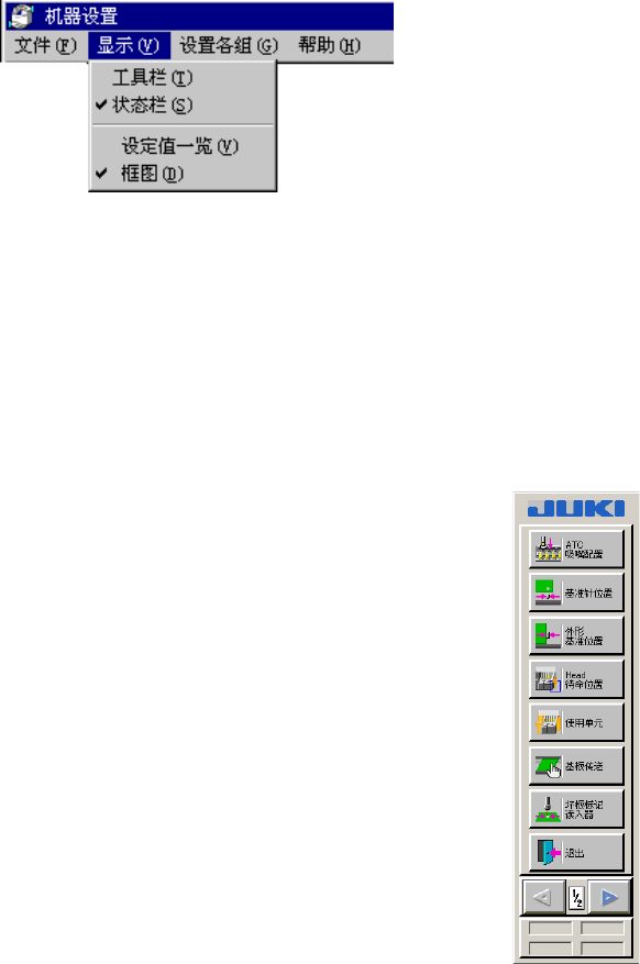 第 9 章 机器设置 9- 4-3 显示 在菜单栏中选择 [ 显示 ] 之后,会显示如下 图所示的命令: 图 9- 4- 44 显示菜单 可以选择显示 / 不显示工具栏、状况栏。 也可切换显示设置值一览和 状态图。 详细情况请参见 [9 - 2 初始画面 ] 。 9- 5 命令按钮 按下画面左侧的命令按钮, 可以调出机器设置的各个菜单项目。 命令按钮中注册的项目,可 根据用户自定义执行。 可以注册的项目是 [ 设置各组 ] 和 [ 显示…