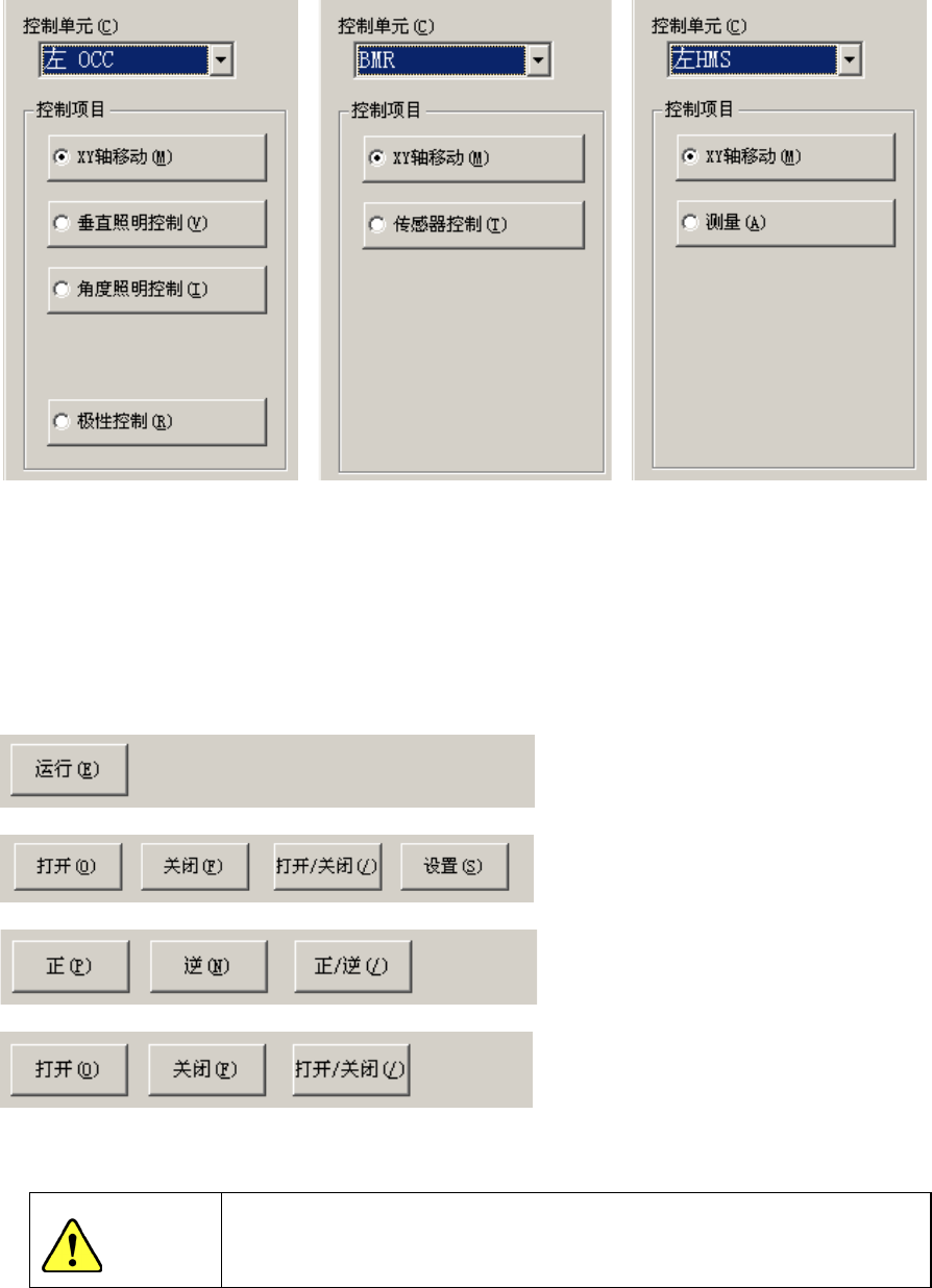 第 10 章 手动控制 在控制单元中,选择 OCC 时的控制方法 1) X Y 轴移动 与控制贴片头的 XY 轴移动相同。 2) 垂直照明控制 控制 OC C 垂直照明的打开 / 关闭。 - 选中控制项 目的 [ 垂直照明控制 ] 时, 选择 [ 打开 ] 按钮、 [ 关闭 ] 按钮、 [ 打开 / 关闭 ] 按钮, 或者按下 [F3] 键、 [F4] 键、 [F5 ] 键来控制。 - 选中控制项 目的 [ 照明控制 ] 时, 选择 […