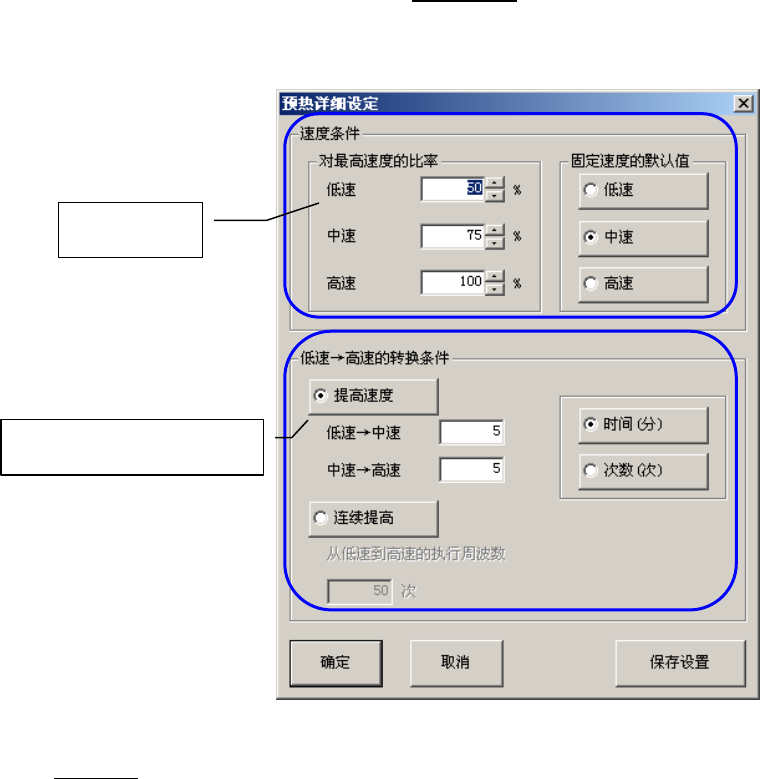 从速度设置中选择[低速→高速]、按下[详细设定]按钮后,显示下列[预热详细设定]对话