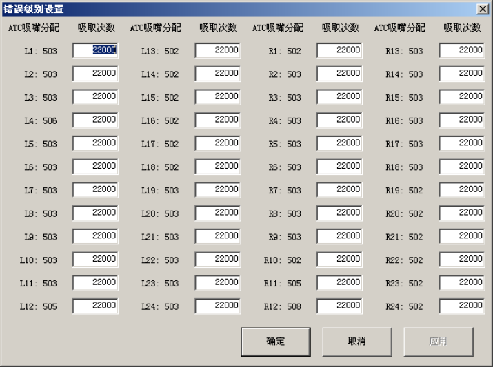 在菜单栏中选择[数据]→[错误级别设置]→[各吸嘴]后,显示下图的[错误级别设置] 对话框,可