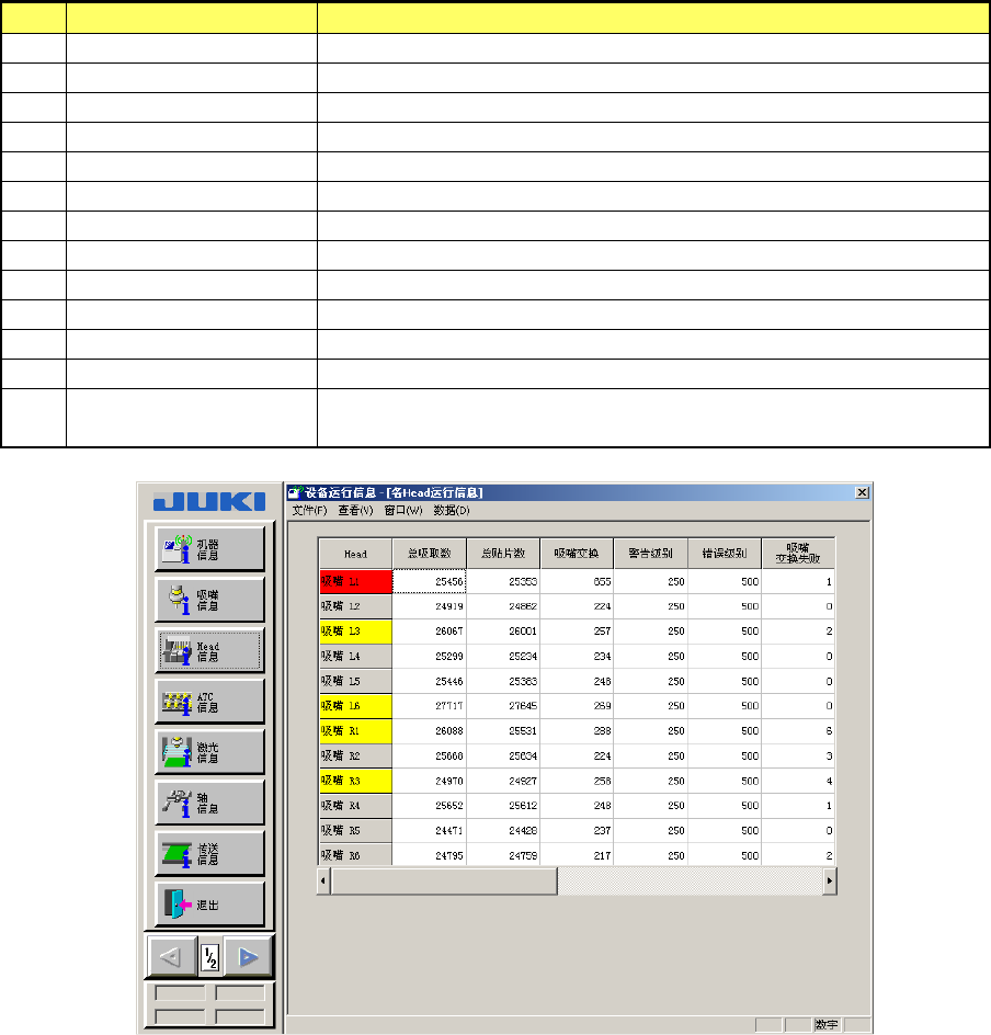 从菜单栏中选择[窗口]→[各 Head 运行信息]后,显示下图的 [各 Head(贴片头)运行信息]表。