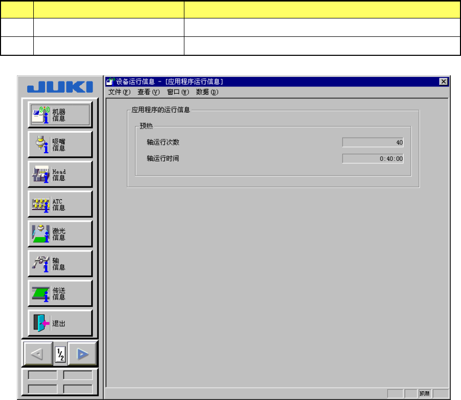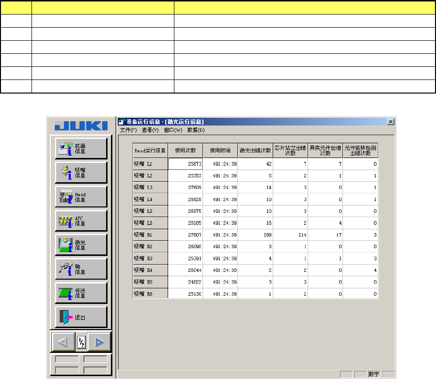 第 14 章 设备运行信息 14 -1- 13 激光运行信息 在菜单栏中选择 [ 窗口 ] → [ 其它 ] → [ 激光运行信息 ] 后,显示 [ 激光运行信息 ] 画面。 表 14 -1- 13 激光运行信息的显示内容 No 项目 内容 1 使用次数 使用激光的累计次数。 2 使用时间 使用激光的累计时间。 3 激光出错次数 发生激光错误的累计次数。 4 芯片站立出错 次数 发生芯片站立错误的累计次数。 5 异类元件出错 次数 发生…