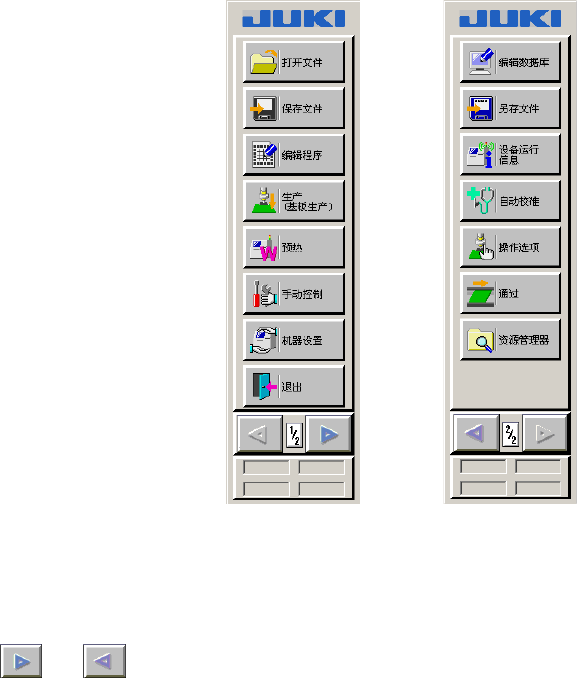 第 2 章 基本操作 2-4-1-2 选择命令按钮 画面左侧显示有各项命令按钮时,按下其按钮就可以执行命令。 用鼠标单击命令按钮,或者按下触摸屏(选项)画面上的命令按钮,即可执行。 图 2-4-6 桌 面的命令按钮 通过按动上列各项命令按钮,进行应用软件的切换和移动画面。 命令按钮共有八个菜单命令项目,分成两页。 按 或 按钮,切换页面。 详细说明请参见『 3 章 菜单和命令按钮』。 2- 14
