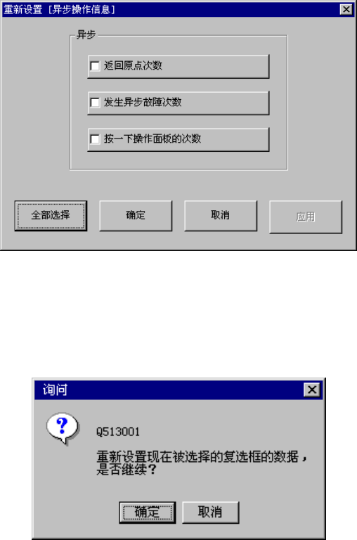第 14 章 设备运行信息 14 -2-9 重新设置传送信息 显示传送信息画面时,在菜单栏中选择 [ 数据 ] → [ 重新设置 ] ,或按下工具栏的 [ 重新设置 ] 按 钮后,显示如下的对话框。 图 14 -2- 15 重新设置传送信息对话框 上述对话框画面列出了数据项目复选框。选择 需要重新设置数据项目的复选框,按 [ 确定 ] 或 者 [ 应用 ] 按钮后,显示以下的对话框。 图 14 -2- 16 询问重新设置传送信息 • 按…