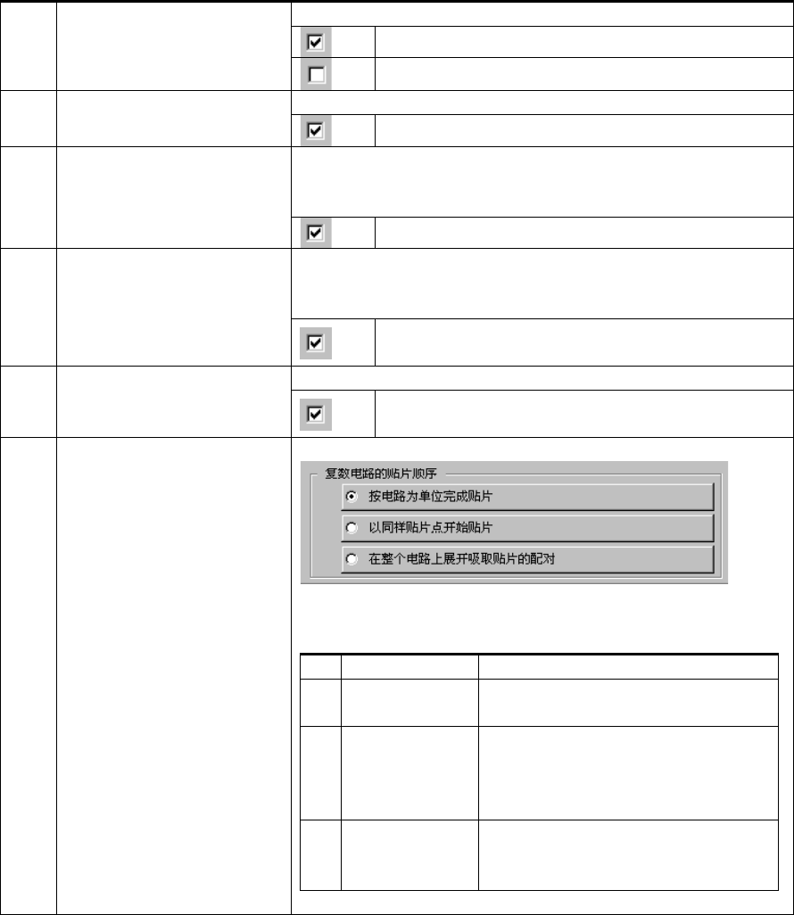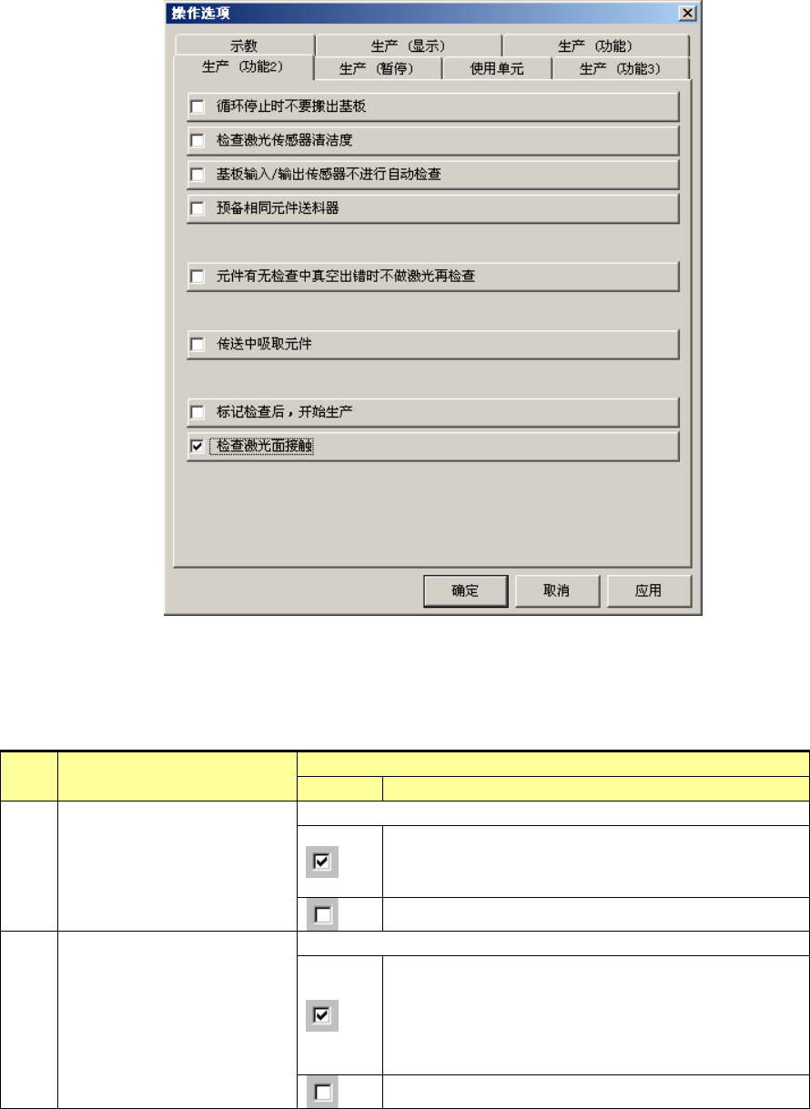 第 15 章 操作选项 4 同时交换吸嘴 设置同时交换吸嘴。 实行同时交换。 不实行同时交换吸嘴。 5 优先 BOC 标记识别 设置优先识别 BOC 标记。 在识别坏板标记前先识别 BOC 标记。 6 生产被中断时,执行继续生 产 生产异常终止时 (发生异步现象、 生产异常终止) , 无条件地生 成继续生产文件。 继续生产的操作步骤请参见 [ 继续生产 ] 。 生产中断时生成继续生产文件。 7 所有电路都是坏板标记时结 束生产 当生产动…