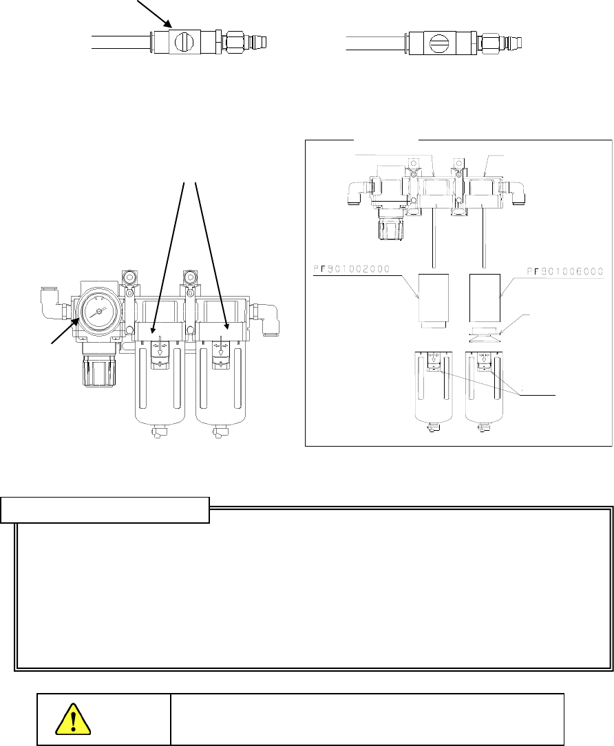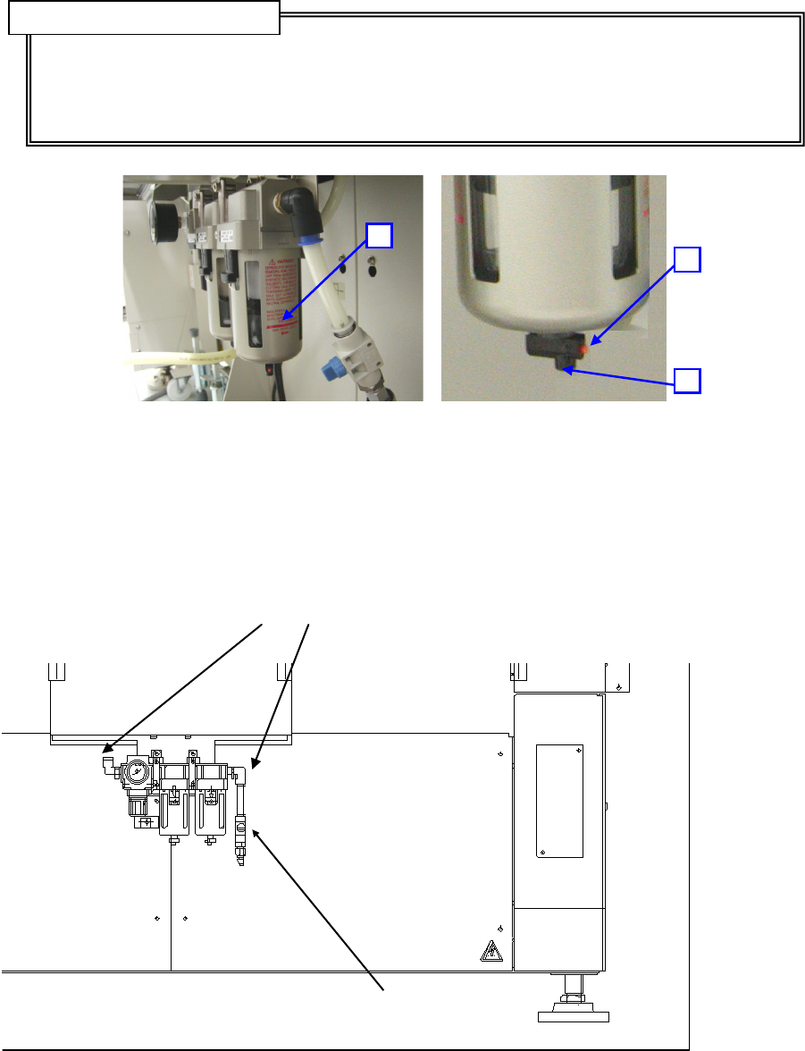 第 16 章 维护 16 -2 各部的检查 16 -2-1 气压 确认压力表的压力为 0. 5 MP a 。 压力在 0.4 5 MP a ~ 0.5 5 MP a 以外时 , 请确认漏气是否为 厂 方原因,如无异常,请按照以下 步骤,重新调整压力。 < 主要压力的设置步骤 > 1 )打开管道旋钮①。 2 )向下拉「调节旋钮② 」, 再旋转旋钮,把使用气压调整到 0. 5 MPa 。 图 16 -2-1 排水阀 和调节旋钮 …