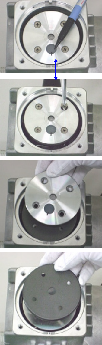 第 16 章 维护 < 压板、皮碗垫圈、吸气阀 防干扰橡胶的拆除方法 > 1) 请用油性记号笔 按照外壳标记部分 在压 板上做标记。 2) 请拆下压板的 4 个小平头螺丝 。 3) 请拆除压板和皮碗垫圈。 16 - 17
