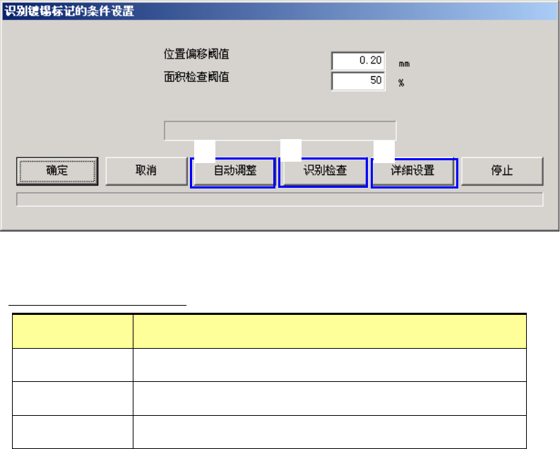 在[识别镀锡标记的条件设置] 画面上选择 [自动调整]按钮,可一边变更参数,一边反复进行