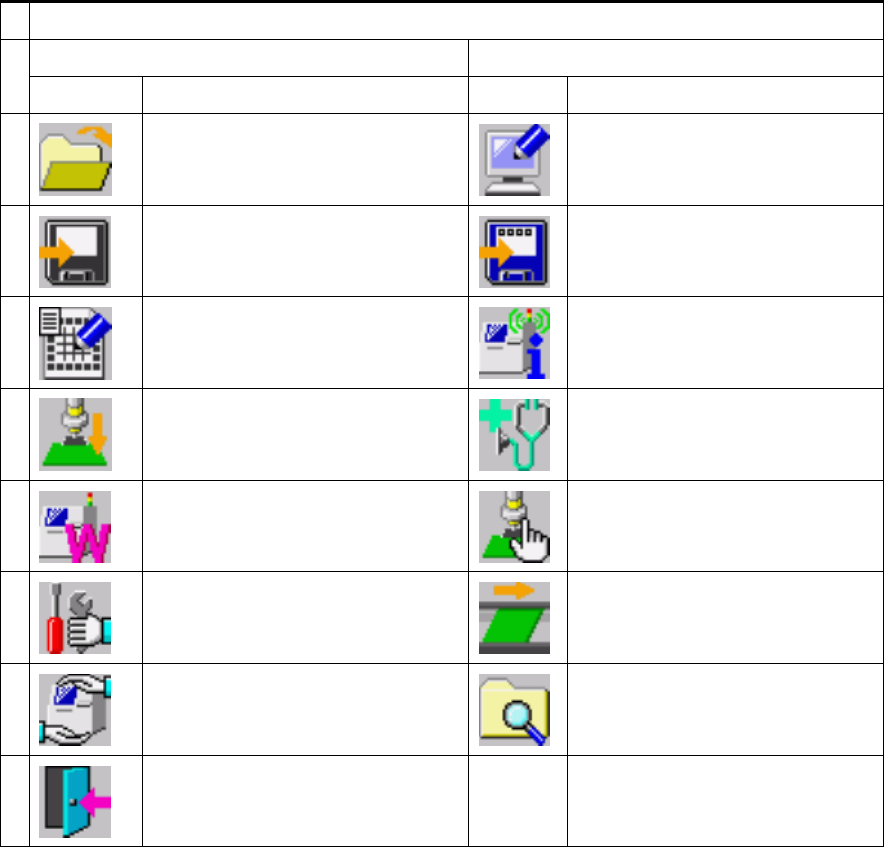 第 3 章 菜单和命令按钮 3-2 命令按钮的构成 本机装载的应用程序,除编辑程序和编辑数据库外,还有各种命令按钮画面、各种应用程序的主 画面。 通过单击画面上的命令按钮,可操作应用程序、切换画面。 也可操作跟踪球、或按触摸屏(选装项)上画面的命令按钮。为提高操作效率,原来的部分菜单 选择项目改为命令按钮,可与菜单的项目选择并用。 下列应用程序,可用命令按钮操作: 1. 桌面 2. 生产 3. 机器设置 4. 手动控制 5. 自动校准 …