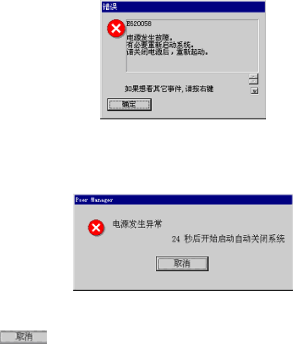 第 4 章 桌面 4-3 停电时的对应措施(选购项) 当 FX -2 供给电源发生异常时, UPS 电源监视功能即可启动。 恢复系统时,需要重新接通电源。 应先把生产程序、生产管理信息、重启生产时 所需要的信息、设备管理信息等保存起来, 再退出系统,关闭电源。 如要停机一段时间不操作时,也要把停机前当时的数据保存下来后,再关闭系统。 4-3-1 停电时的处理 步骤 1 .自动关闭的准备工作 当系统检出电源发生异常时,显示下列对话框: 图…