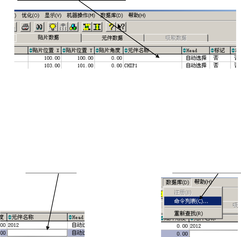 ①请单击空白的元件名称栏。 ②请单击「数据库」/「命令列表」。