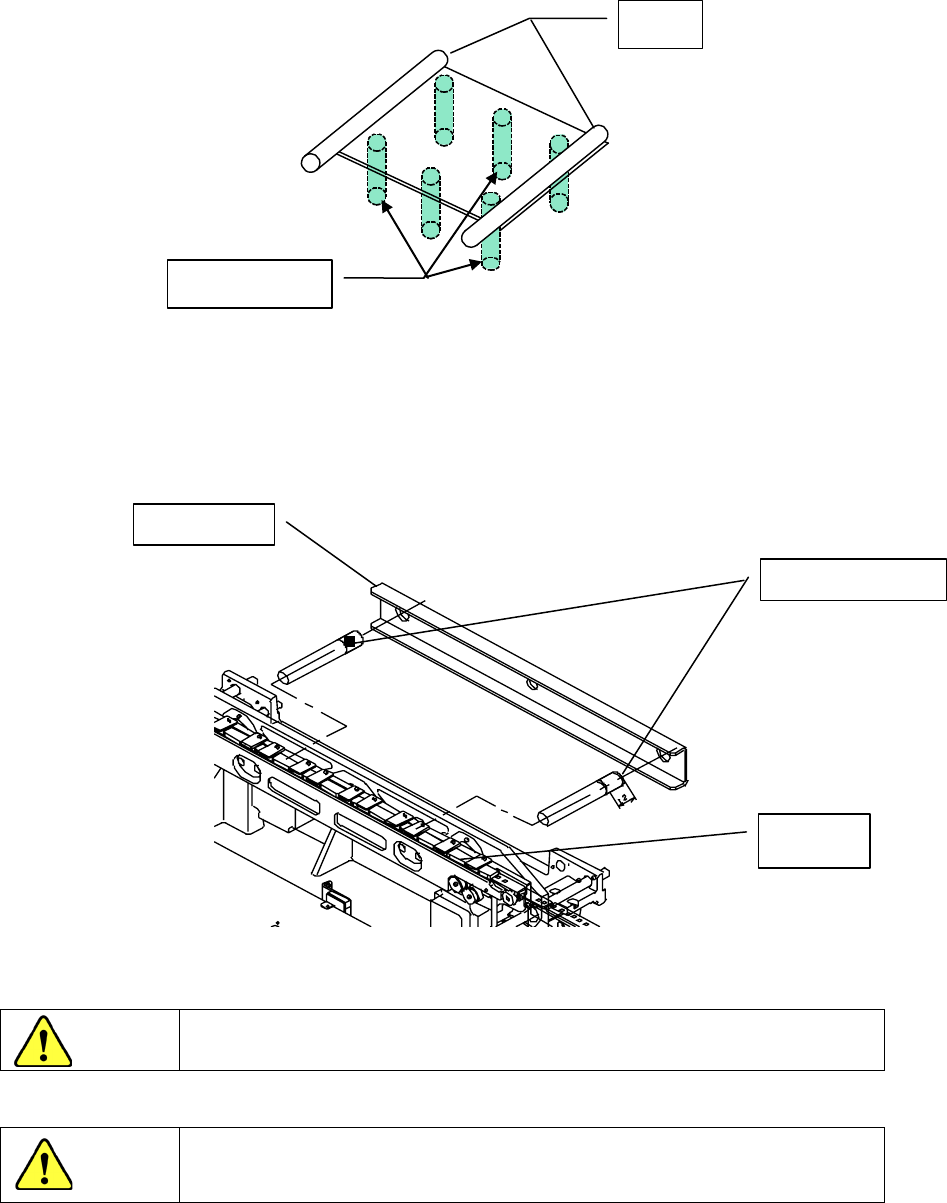第 16 章 维护 16 -4-7 支撑台 请在 3 处 * 标记的滚珠丝杠轴上全面涂抹润滑脂。 用手抬起支撑台从两侧涂抹。 2 个侧梁整个都要涂抹润滑脂。 图 16 - 4 - 9 支撑台 16 -4-8 弹性导向轴 弹性导向轴两端要涂上润滑脂,从端点起涂约 1 2mm 长。(与弹性支架接触的部分) 图 16 -4- 10 弹性导向轴 危险 为了防止意外启动造成的事故,请在关闭电源后再进行操作。 注意 请不要涂抹 ( 6459N 润滑…