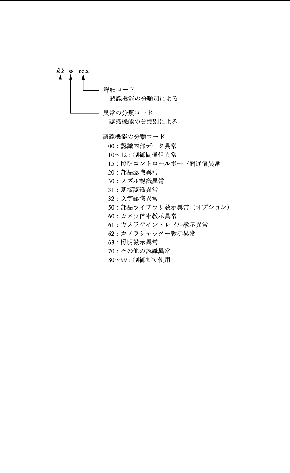Tg0854-PM-ER 1. 認識異常からのトラブルシューティング 0304-001 4-2 認識異常表示画面から “ H 部表示 ( 認識異常コード ) ” 、 “ A 部表示” 、 “ B 部 表示” 、 “ C 部表示” を確認し、次のようにまとめられているトラブルシュー ティングを参考にしながら復帰してください。 ( 要因 1 ) モータのエンコーダ部の不良が考えられます。 ( 要因 2) エンコーダケーブルの断線が考えられま…