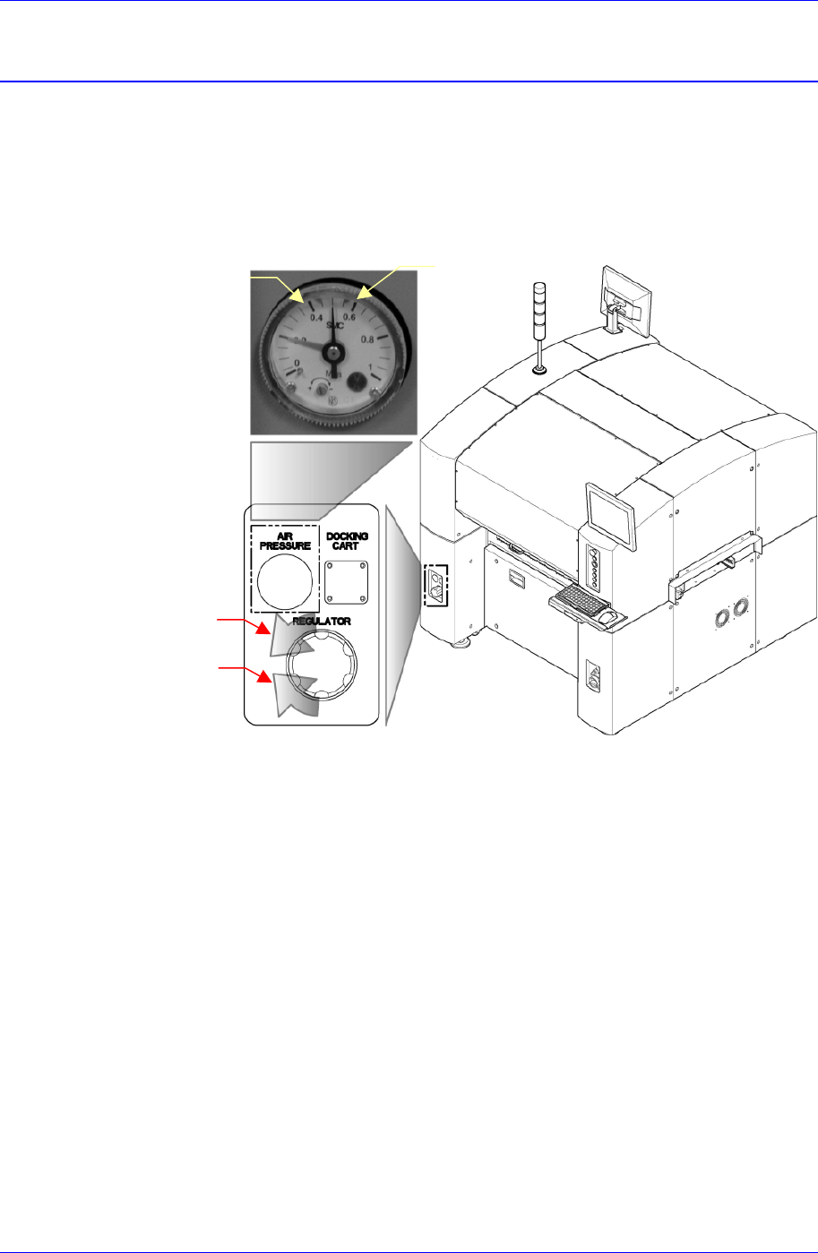 设备的启动及生产 第 2 章 . 设备的启动及生产 说明设备的启动方法与设备运转 的结束方法。 2-1 2.1. 设备的启动顺序 2.1.1. 设备启动前的检验 气压 (Air Pressure) 检查设备背面气压表的指针是否 位于 0.45 ~ 0.55 MPa 范围内。 ( 指针应位于 两个绿色刻度之间 ) 最大压力刻度 最小压力刻度 压力减少 压力增加 额定电压 ( 单相 AC 220 V ± 10 %)