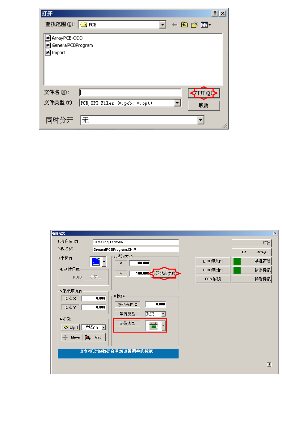 设备的启动及生产 2-7 选择需要进行作业的 PCB 文件后,单击 < 打开 (OPEN)> 按钮 。 这时,选择包含了喂料器配置的 优化文件后,选择 < 打开 > 按钮。 ( 扩展名为 opt 的 文件是已经完毕优化的文件。 ) 2.2.2. 轨道宽度设置 当需要针对与已经作业过的 PCB 形 式不同的 PCB 进行作业时,应修改 传输轨道宽 度设置。 传输轨道宽度调节 根据需要作业的 PCB 的宽度来调节…