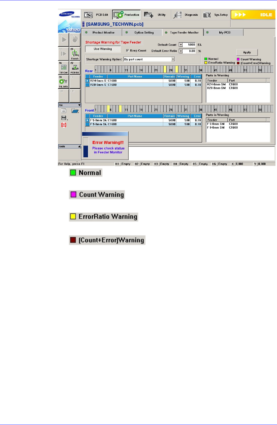 Samsung Component Placer SM320 Operator’ s Guide 表示正常的带式喂料器。 表示部件残存小于设定值的带式 喂料器。 表示部件供给错误发生率大于设 定值的带式喂料器。 表示同时发生部件残存不足和部 件供给不良的带式喂料器 。 2-16