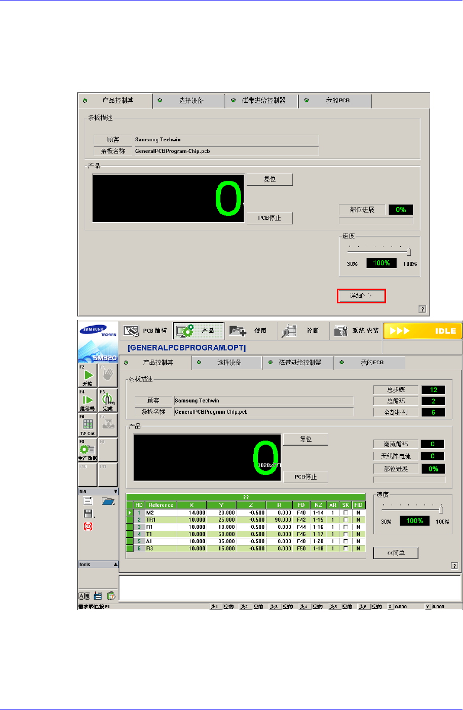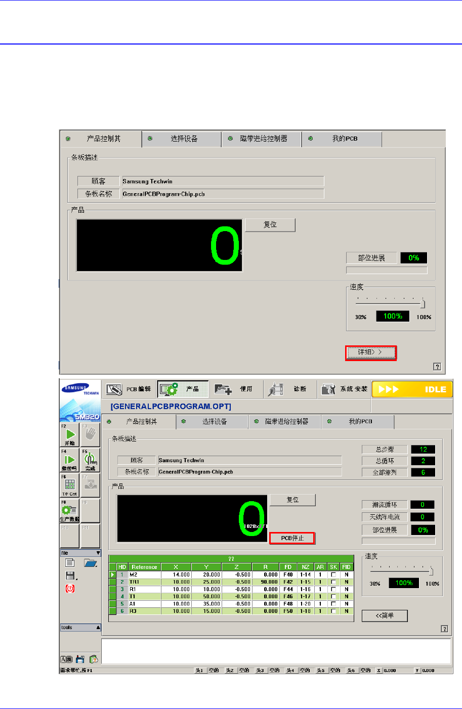 自动生产时,把 Production 菜单的主屏幕设置为“详细”后,单击<PCB Stop>