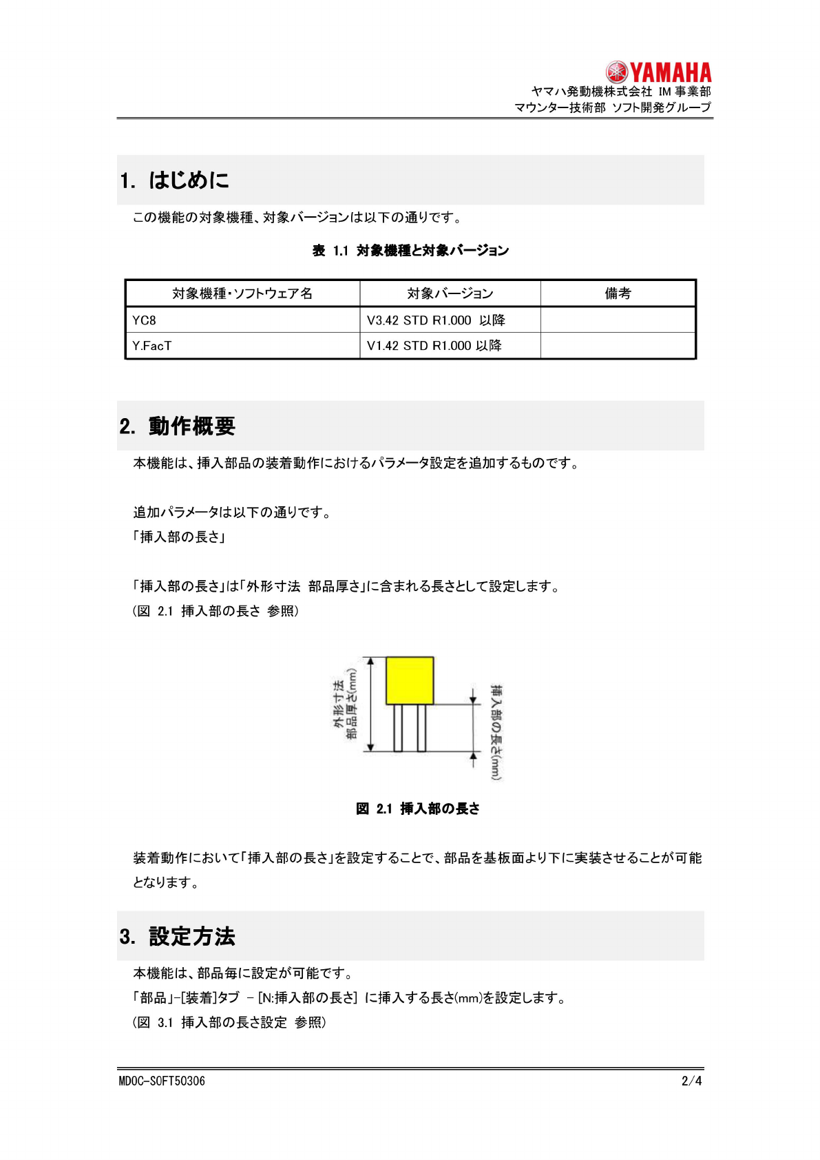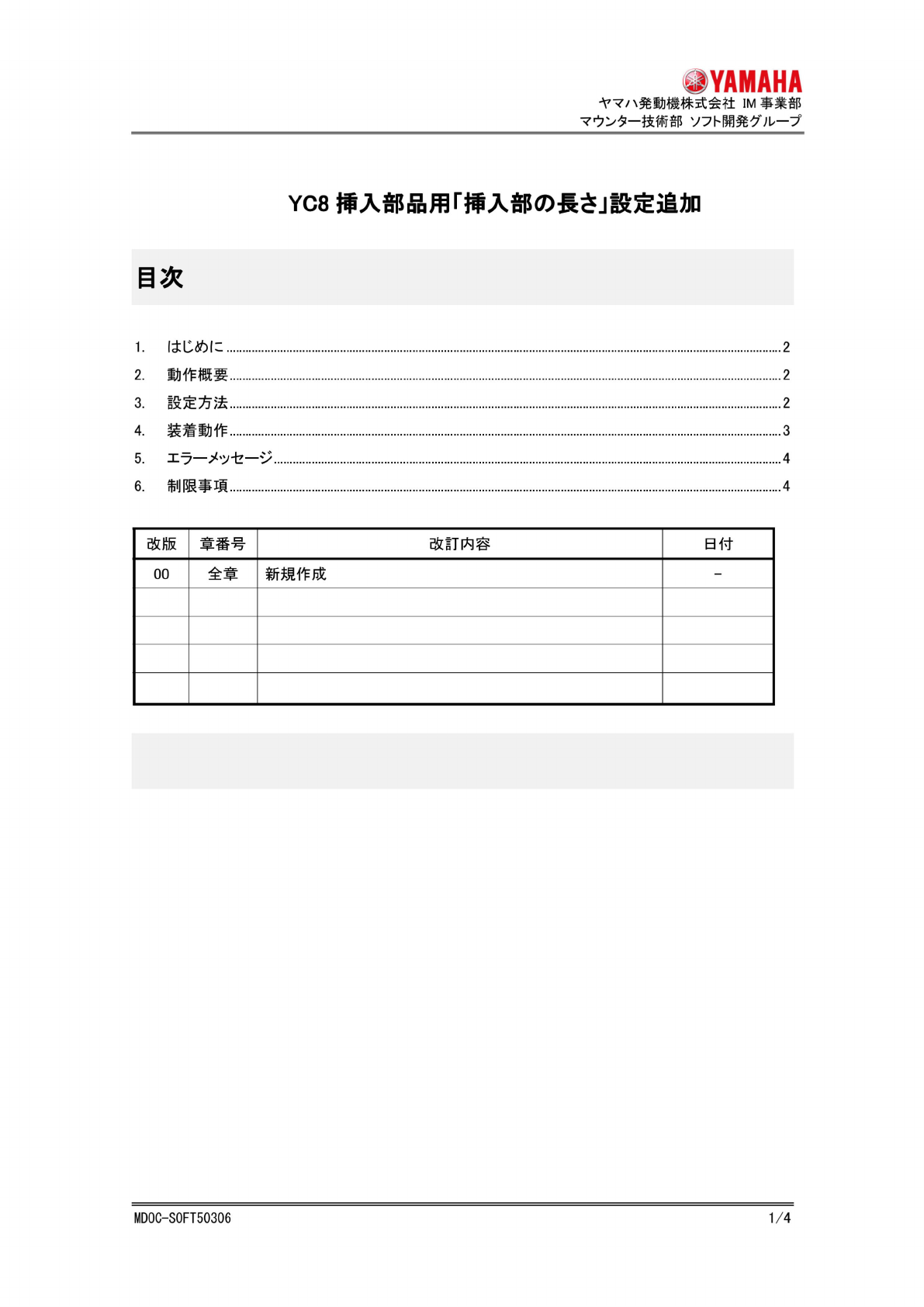 ^YAMAHA 八髡 勤 檄株 式会社 IM 事渠部 夕 一技彳 后部 卜^ 一 ^ YC8 t? 入 部品用 「乖 入部 (7)房 太」^ 定追加 目次 1 . 1 上心的仁 2 2 . 勤 作概要 2 3 . 联殳 定方法 2 4 . 装着 勤 作 3 5 . 工^ — — V 4 6 . 制限事 项 4 改版 章番号 改 rr 内容 日付 00 全章 新 规作成 - MD0C-S0FT50306 1/4