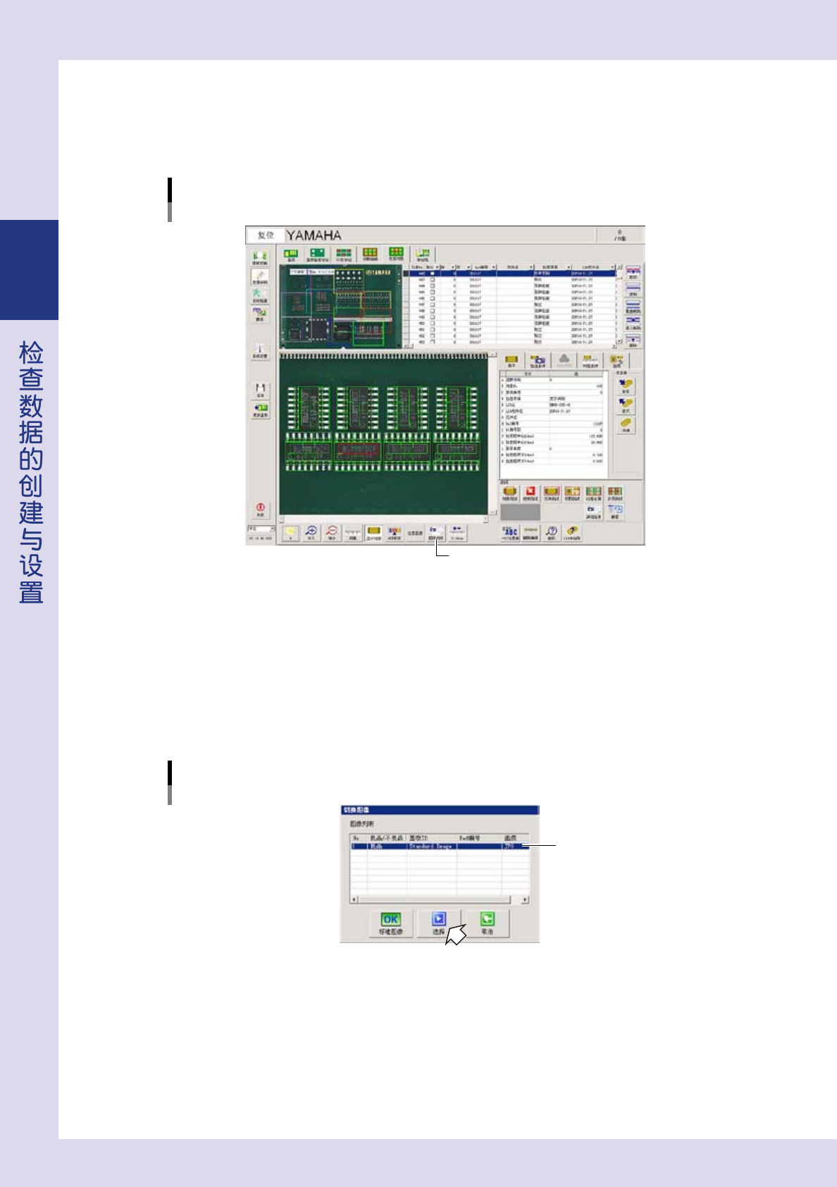 2-32 2 ■ 利用保存的视野图像 打开保存的视野图像,可以确认所创建的检查数据和更改参数等。 1 选择要确认的检查对象。 [数据编辑] -「检查对象」画面 [图像列表]按钮 [图像列表]按钮 26237-P9-00 2 按 [ 数据编辑 ]-「检查对象」画面的 [ 图像列表 ] 按钮。 显示图像列表画面。 3 选择基板 ID。 从图像列表中选择想要显示的基板 ID 后,按 [ 选择 ] 按钮。 下侧的视野图像中切换为所选择的图像,…