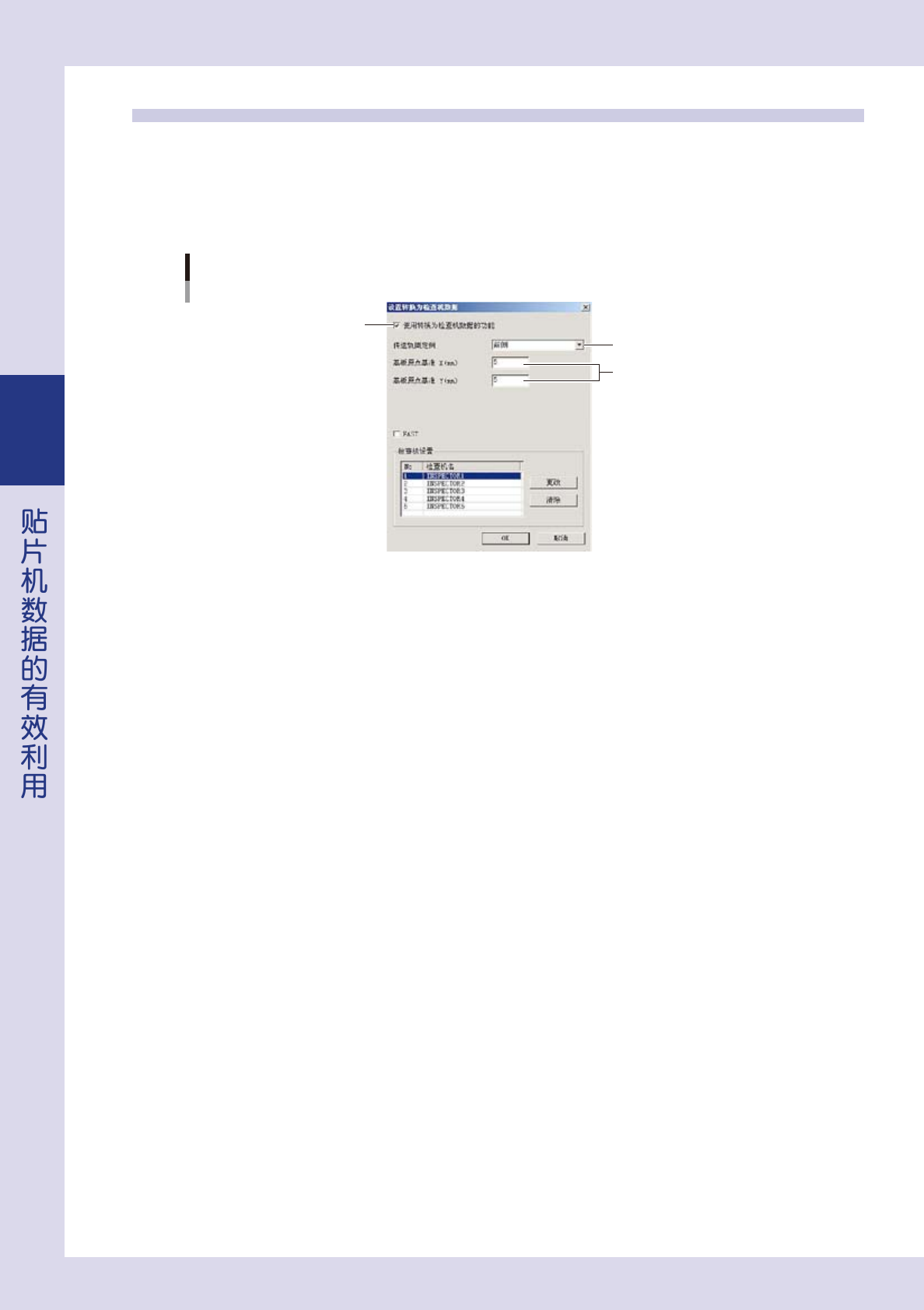 3-6 3 1.2 P-Tool 的设置 以下,介绍在 P-Tool 创建检查程序时必要条件的设置方法。 1 启动基板资源管理器。 2 从「维护」菜单打开「设置转换为检查机数据」的画面。 「设置转换为检查机数据」画面 Step 3 Step 4 Step 5 26306-P9-00 3 勾选「使用转换为检查机数据的功能」的选择框。 4 设置传送轨的固定侧。 按照贴片机的传送轨基准选择。 5 设置基板原点基准 X、Y。 使用 YAMAHA…