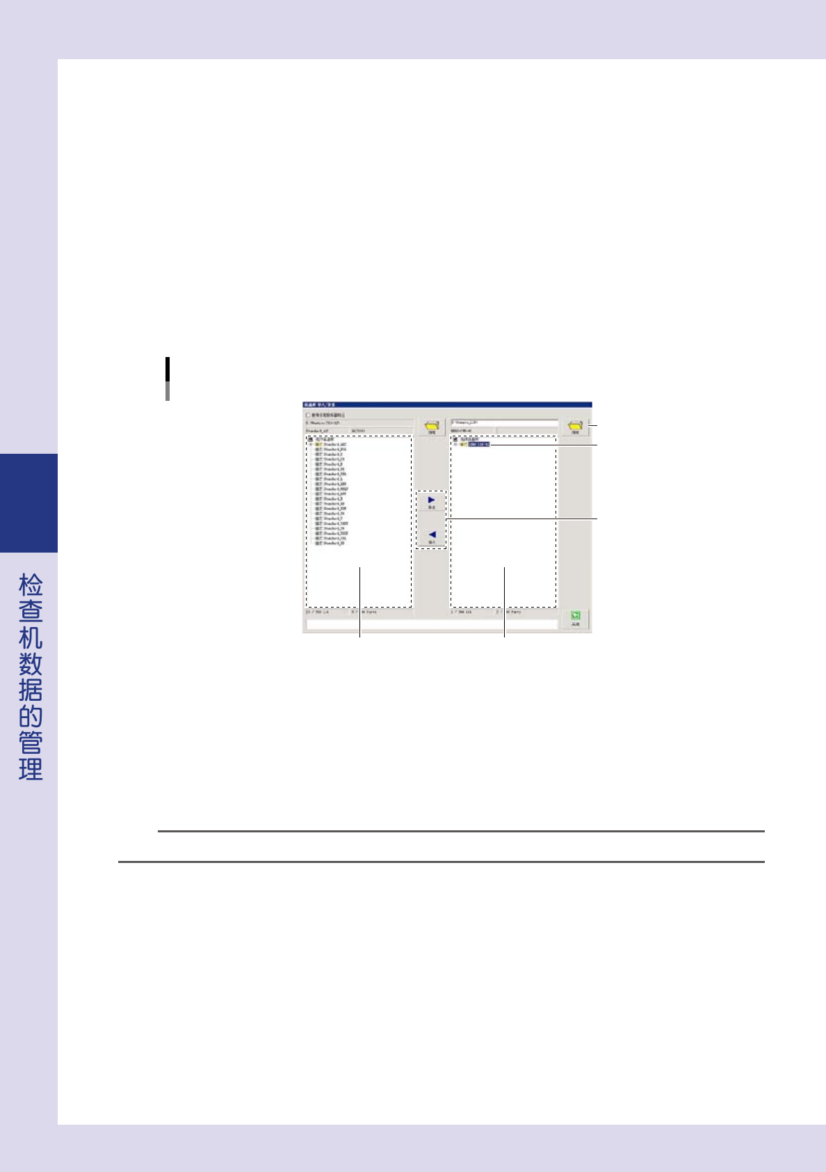 「信息库 导入 / 导出」画面的右侧显示所选信息库文件夹中的信息库,左侧显示检查机所参照的信息库。