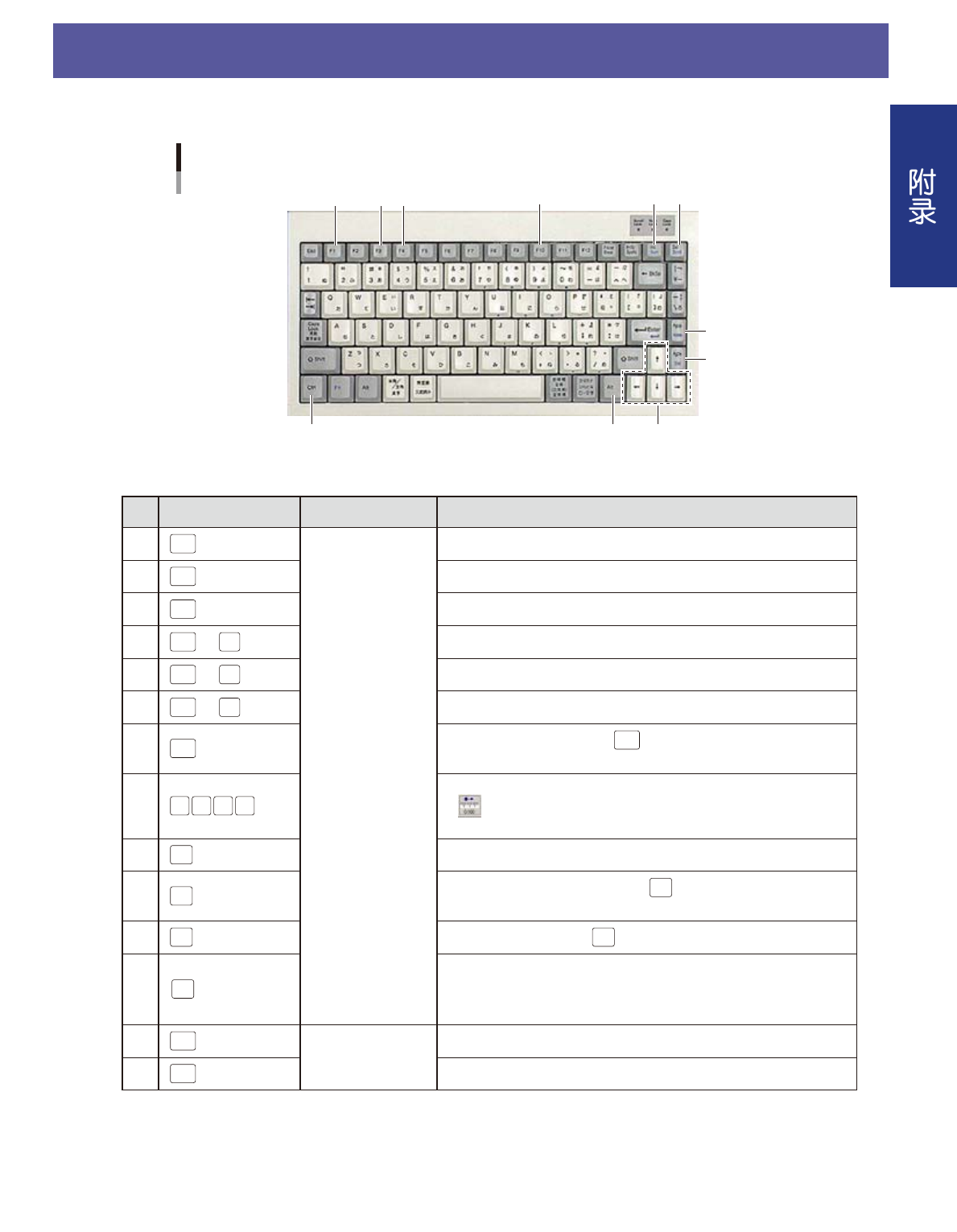 A-1 1. 键盘快捷键 在 [ 数据编辑 ]-「检查对象」画面、不良视窗画面和 2 次判定画面,可以使用下列快捷键。 9 键盘例 10 11 12 13 14 1 2 3 8 [Ctrl] 25000-P9-00 ■ 快捷键功能列表 快捷键 可以操作的画面 功能 1 Home [ 数据编辑 ]- 「检查对象」画面 使光标移至所选视野的起始检查对象。 2 End 使光标移至所选视野的末尾检查对象。 3 Del 删除所选 (…