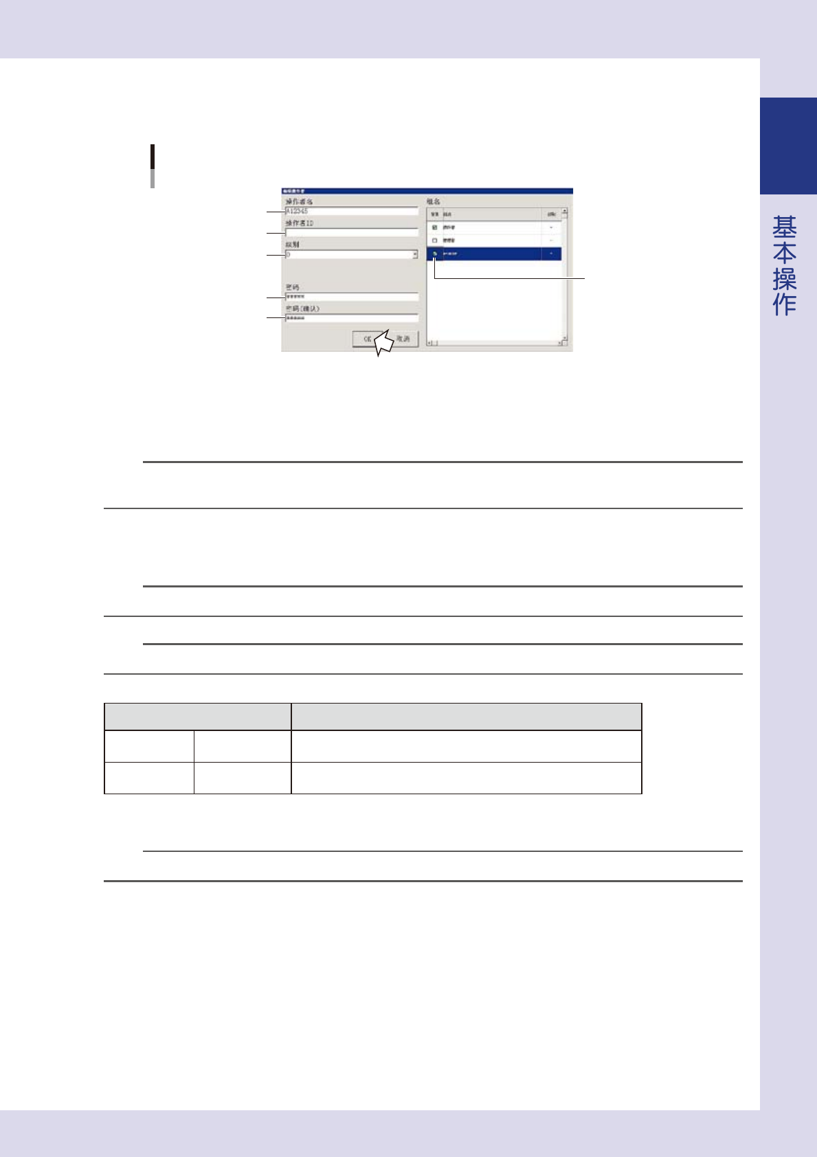显示「操作者管理」画面后,按 [ 操作者 ] 按钮。