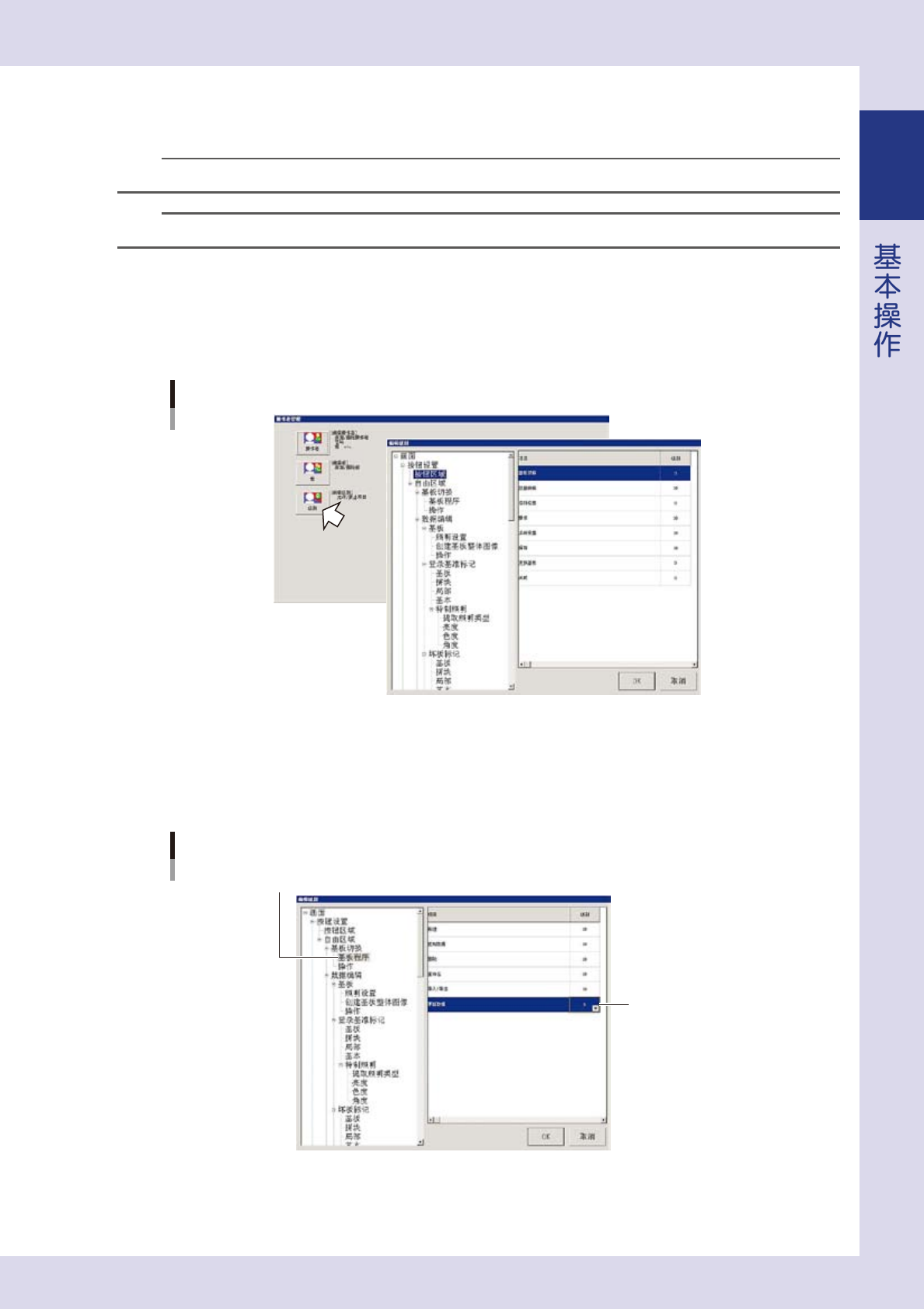 1-27 1 ■ 级别的编辑 以下,介绍更改级别的方法。 n 要点 此操作仅限管理人员 ( 级别 10) 可执行。 参考 默认设置中,级别 0 为几乎所有的操作都受限,无法进行任何设置,而级别 10 则可以进行所有操作。 1 按「系统设置」画面的 [ 操作者管理 ] 按钮。 显示「操作者管理」画面。 2 按 [ 级别 ] 按钮,打开「编辑级别」画面。 「编辑级别」画面 26137-P9-00 3 编辑项目的级别。 1. 从左侧树状视图选…