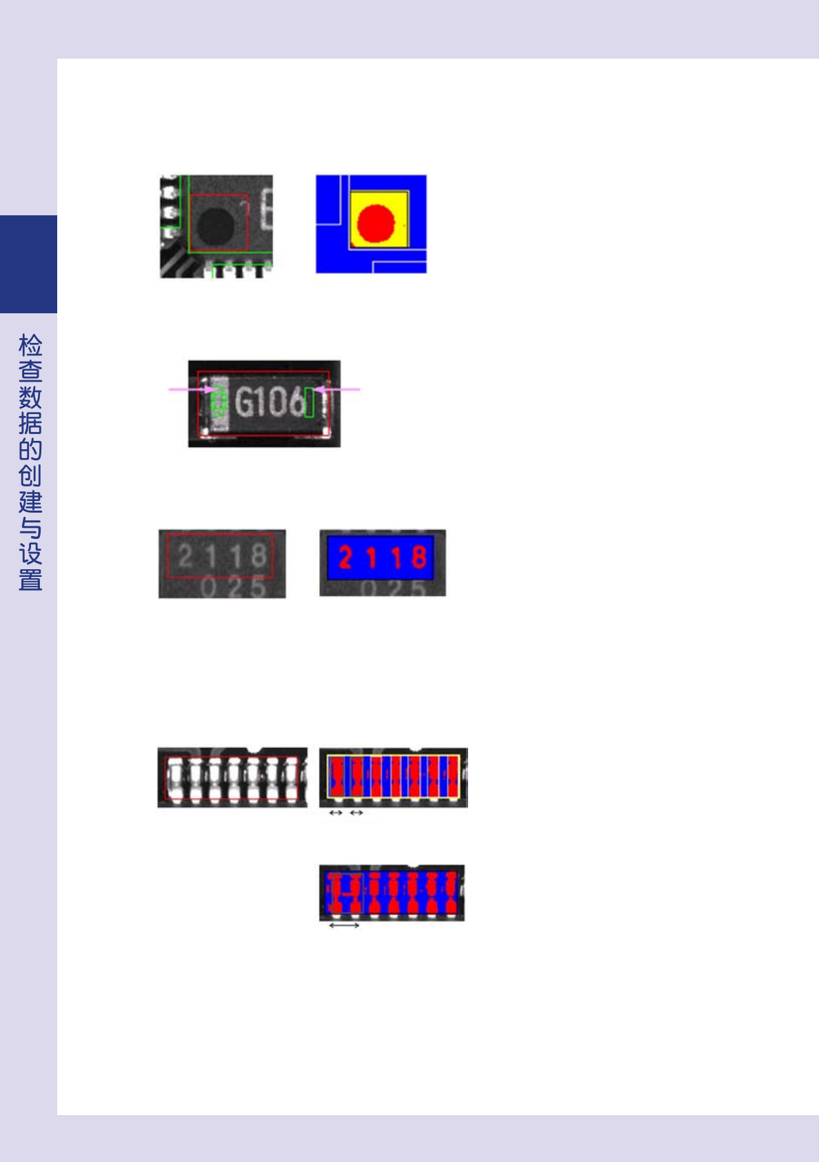 2-2 2 ■ 极性 根据元件类型不同,分别有 3 种检查方法。 ‧ 极性检查 检出极性标记,根据其面积和尺寸判定极性。 26203-P9-00 ‧ 对比 根据 2 处的亮度差判定极性。 1 2 26204-P9-00 ‧ 文字识别 检出文字,通过判定文字角度和对所设置的文字与识别到的文字进行比较,判定极性。 26205-P9-00 ■ 连焊 ‧ 引脚检查 根据检查部位不同,分别有 4 种检查方法。 1. 最大容许尺寸 检出检查框…