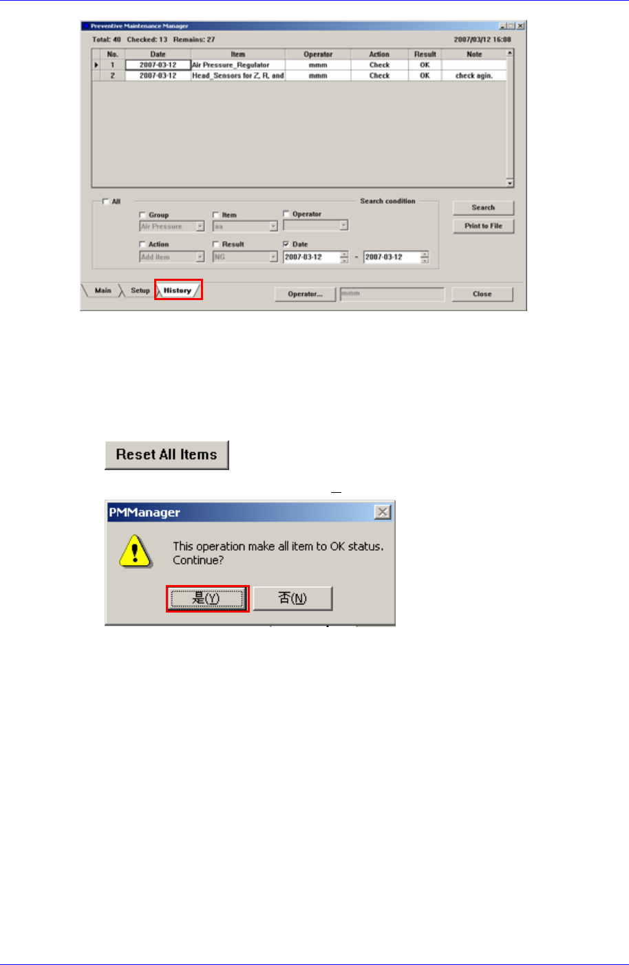 附录 A . PM Manager A-9 如上进行设置时 Main 画面的所有项目改变为检查完成 的状态的同时需要检查的项 目数 (Remains) 变为 “0” 图 A-9. PM Manager 的 Main 画面 History 画面中记录所有变更项目的 历史,同时在 Note 中显示 “Reset all i tems” 。 A.4.7. 以文件形式输出检查项目 所有的检查项目可以用 Te x t 文件的形式输出。 方法如下。…